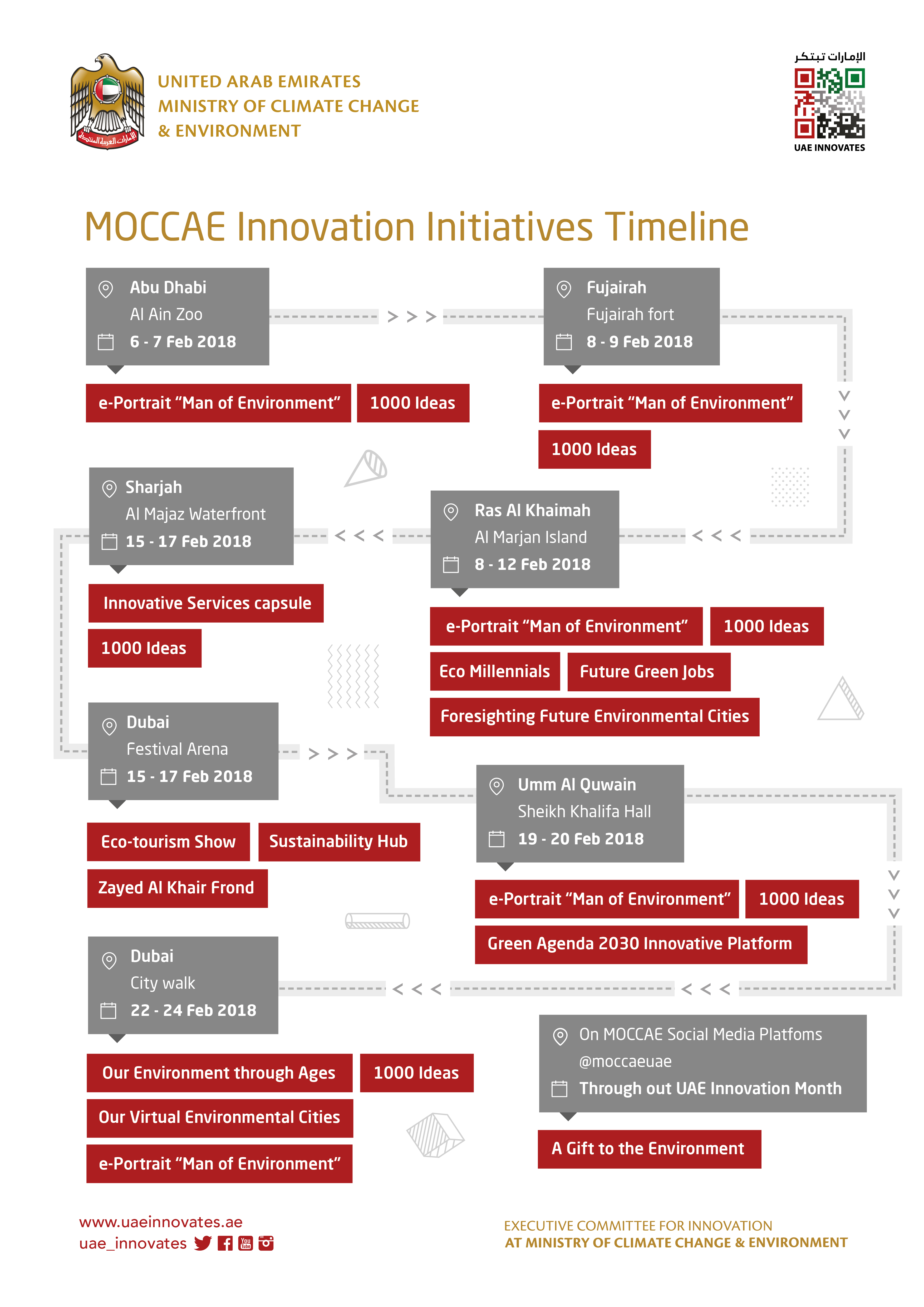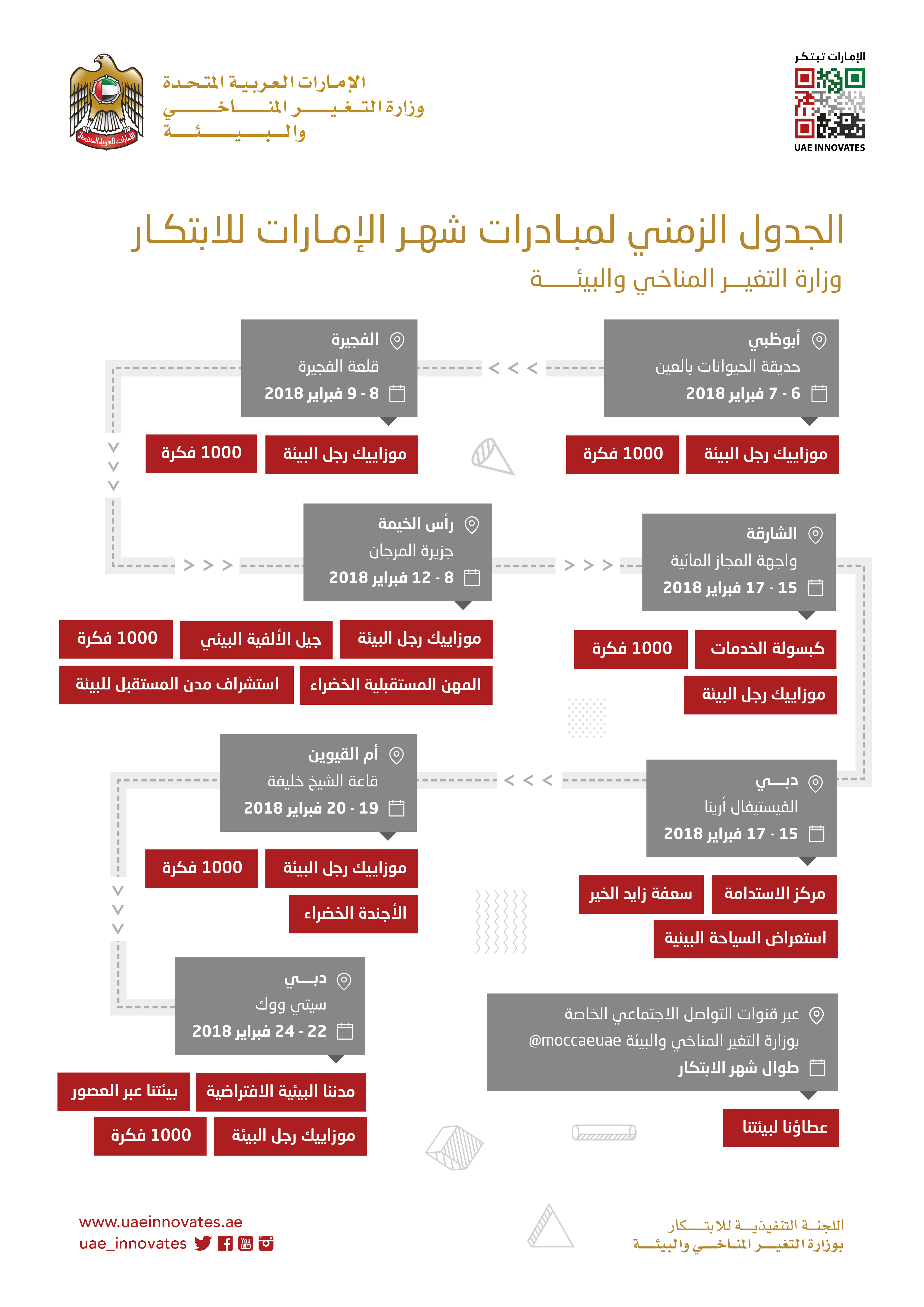 تنظم وزارة التغير المناخي والبيئة ضمن مشاركتها في فعاليات شهر الإمارات للابتكار على مدار شهر فبراير الجاري، 11 فعالية على مستوى إمارات الدولة كافة، تستهدف دعم وتشجيع قدرة فئات المجتمع كافة وخاصة الشباب على الابتكار، وتسليط الضوء على أنشطة اللجنة الابتكارية في الوزارة، وخلق منصات تفاعلية إيجابية مع الجمهور.