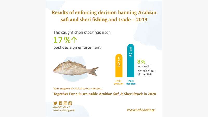 كشفت وزارة التغير المناخي والبيئة عن تسجيل لزيادة في كميات المصيد لأسماك الصافي والشعري بنسب 30%، و17% على التوالي كنتيجة لتطبيق القرار الوزاري رقم 501 لعام 2015 بشأن تنظيم صيدها سنوياً تزامنا مع موسم تكاثرها خلال الفترة من الأول من شهر مارس وحتى نهاية شهر أبريل من كل عام.