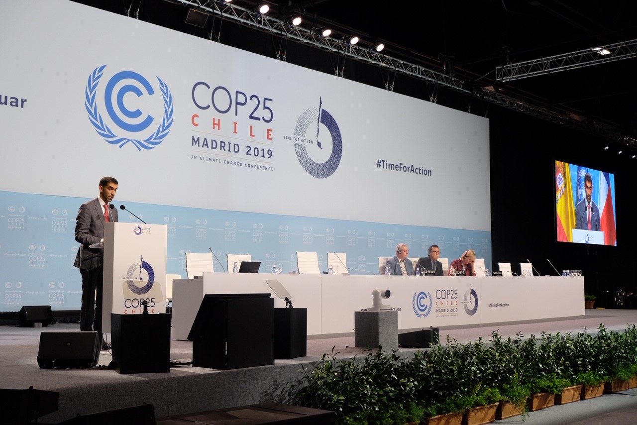 وطالب معالي الدكتور ثاني بن أحمد الزيودي وزير التغير المناخي والبيئة في كلمة دولة الإمارات خلال الفعالية الرسمية للمؤتمر الـ 25 لدول الأطراف في اتفاقية الأمم المتحدة الإطارية بشأن المناخ بضرورة تفعيل مستويات متقدمة من التعاون المثمر مع بين كافة الأطراف العاملة في هذا المجال بما فيها الأمانة العامة لاتفاقية الأمم المتحدة الإطارية من بشأن المناخ والدول المتقدمة وذات الجهود البارزة في هذا العمل لتوفير التقنيات اللازمة والدراسات العلمية والأبحاث وتدريب الكوادر حتى يتمكن المجتمع الدولي ككل من الحفاظ على كوكب الأرض ومواجهة التحديات التي يفرضها التغير المناخي.