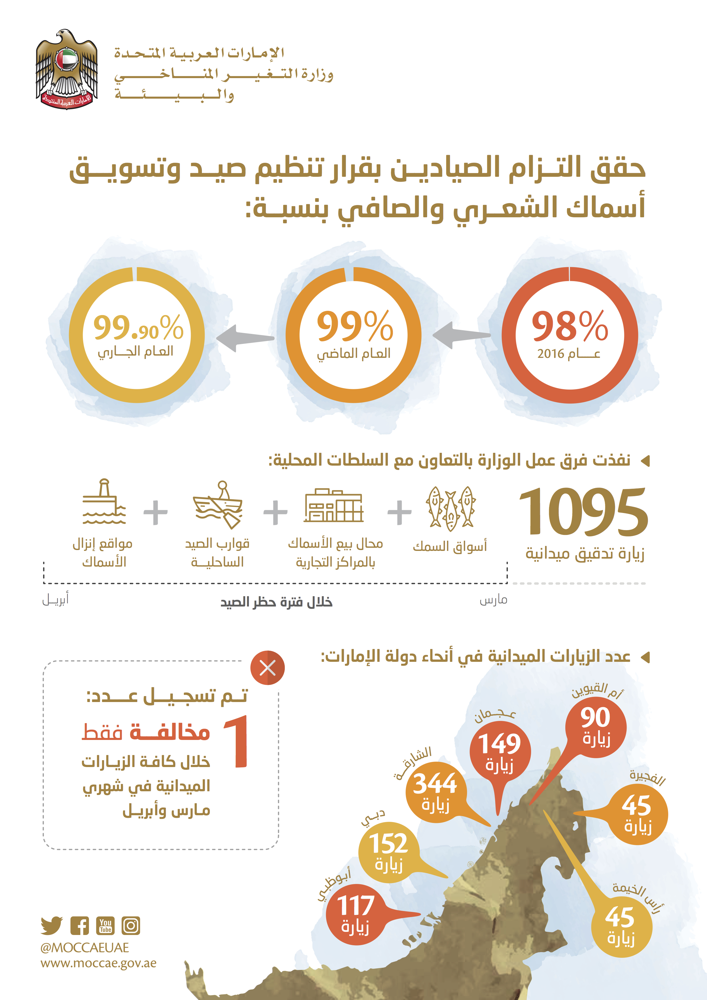 وأوضح الزعابي أن " الإجراءات والتدابير التي اتخذتها الوزارة على المنشآت السمكية ساهمت بشكل كبير في إنجاح حملة تنفيذ القرار، حيث تم تنفيذ عدد من الحملات وورش العمل التثقيفية والتوعوية للعاملين بالقطاع والمسؤولين عنه، كما نفذت فرق عمل الوزارة بالتعاون مع السلطات المحلية 1095 زيارة تدقيق ميدانية استهدفت أسواق السمك، ومحال بيع الأسماك بالمراكز التجارية، وقوارب الصيد الساحلية، ومواقع إنزال الأسماك خلال فترة حظر الصيد في شهري مارس وأبريل الماضيين".