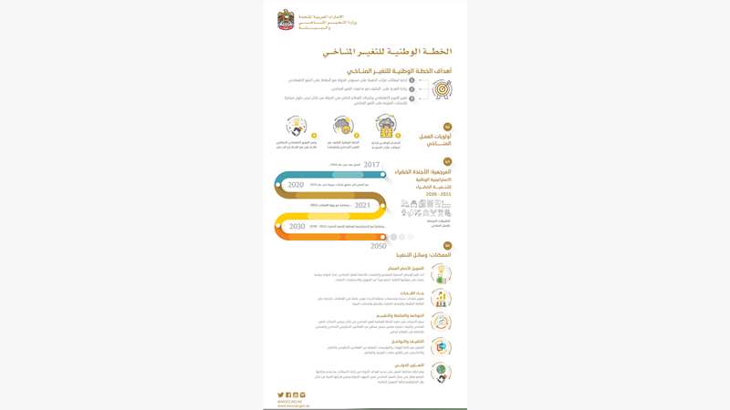 أعلن صاحب السمو الشيخ محمد بن راشد آل مكتوم، نائب رئيس الدولة رئيس مجلس الوزراء حاكم دبي (رعاه الله)، عبر حسابه الخاص في تويتر عن اعتماد مجلس الوزراء خلال اجتماعه يوم أمس الخطة الوطنية للتغير المناخي، التي تعتبر الأولى من نوعها في المنطقة وتعبّر عن توجه الدولة القائم نحو التنمية المستدامة ورفع جودة الحياة، وتحديد الأولويات وتوحيد الجهود لسد الثغرات وضمان تعزيز التعاون بين القطاعين الحكومي والخاص بما يخدم مصالح الدولة على المستويين المحلي والدولي.
