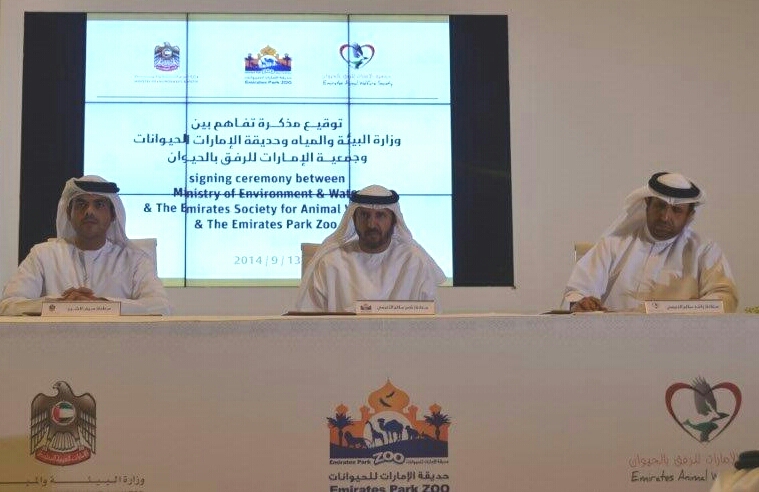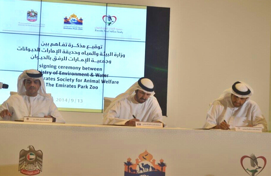 وقّعت وزارة البيئة والمياه مذكرة تفاهم مع كل من "جمعية الإمارات للرفق بالحيوان"و"حديقة الإمارات للحيوانات" بشأن وضع أسس التعاون المشترك بينها لرفع مستوى الوعي العام حول ثقافة الرفق بالحيوان، وذلك على هامش مشاركتها في معرض الصيد والفروسية الذي يقام في العاصمة أبوظبي خلال الفترة من 10 إلى 13 من سبتمبر الجاري .