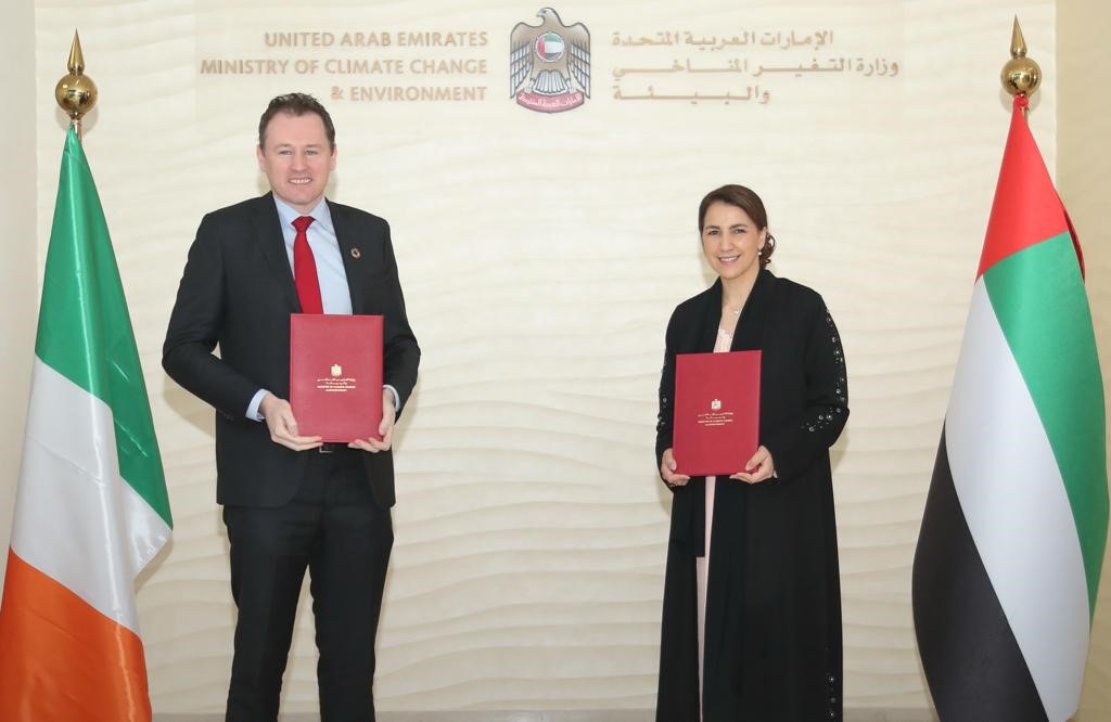 وقع الاتفاقية معالي مريم بنت محمد المهيري وزيرة التغير المناخي والبيئة، ومعالي تشارلي ماكونالوغ وزير الزراعة والغذاء والبحرية في أيرلندا.