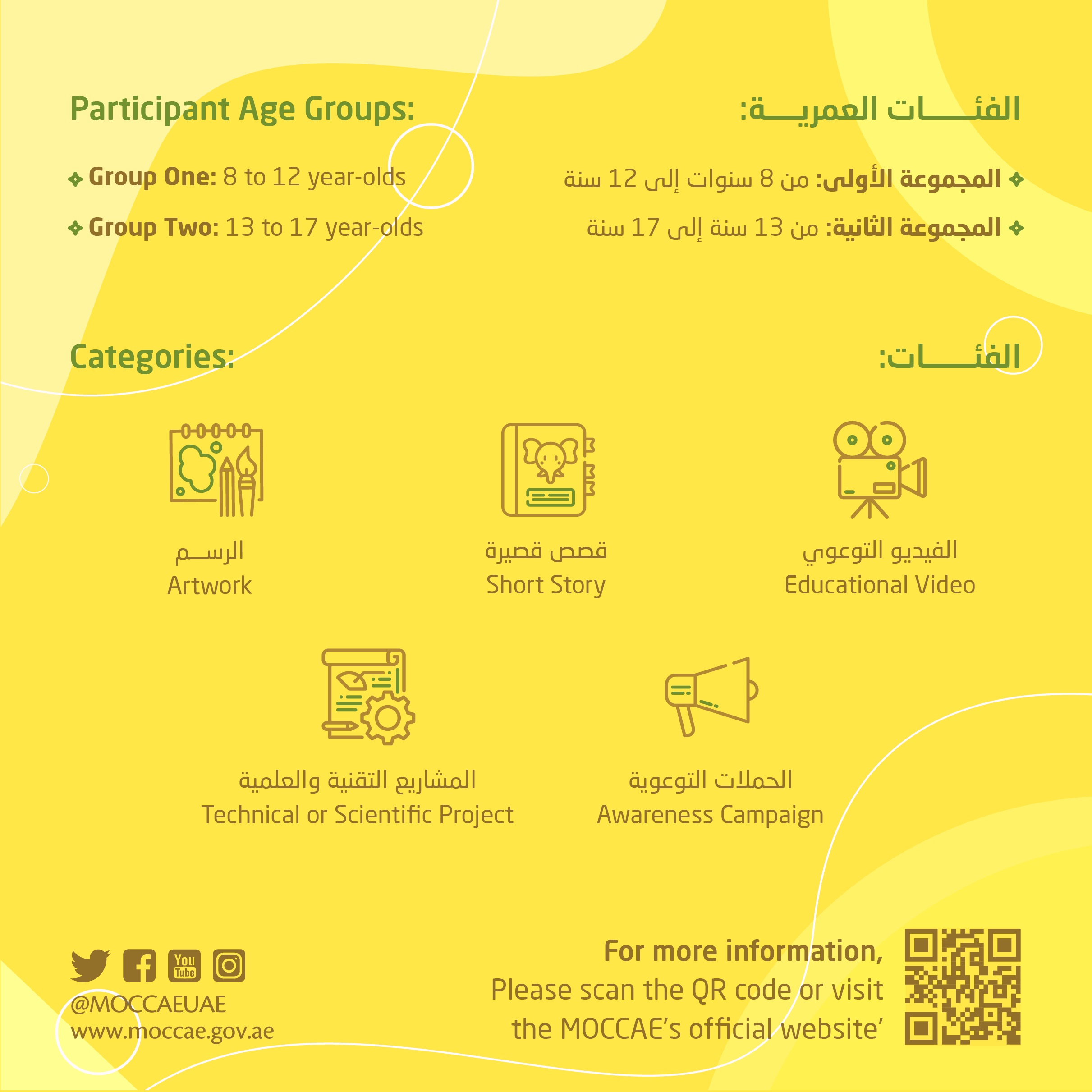 وحددت الجائزة الفئات المستهدفة والمقسمة لمجموعتين المجموعة الأولى من 8 سنوات الى 12 سنة أما المجموعة الثانية من 13 سنة الى 18 سنة، إذ يمكن للمجموعة الأولى المشاركة بفيديو توعوي، أو قصص قصيرة، أو الرسم أما المجموعة الثانية يمكنها المشاركة في جميع فئات الجائزة بالإضافة إلى حملة توعوية أو المشاريع التقنية أو العلمية.