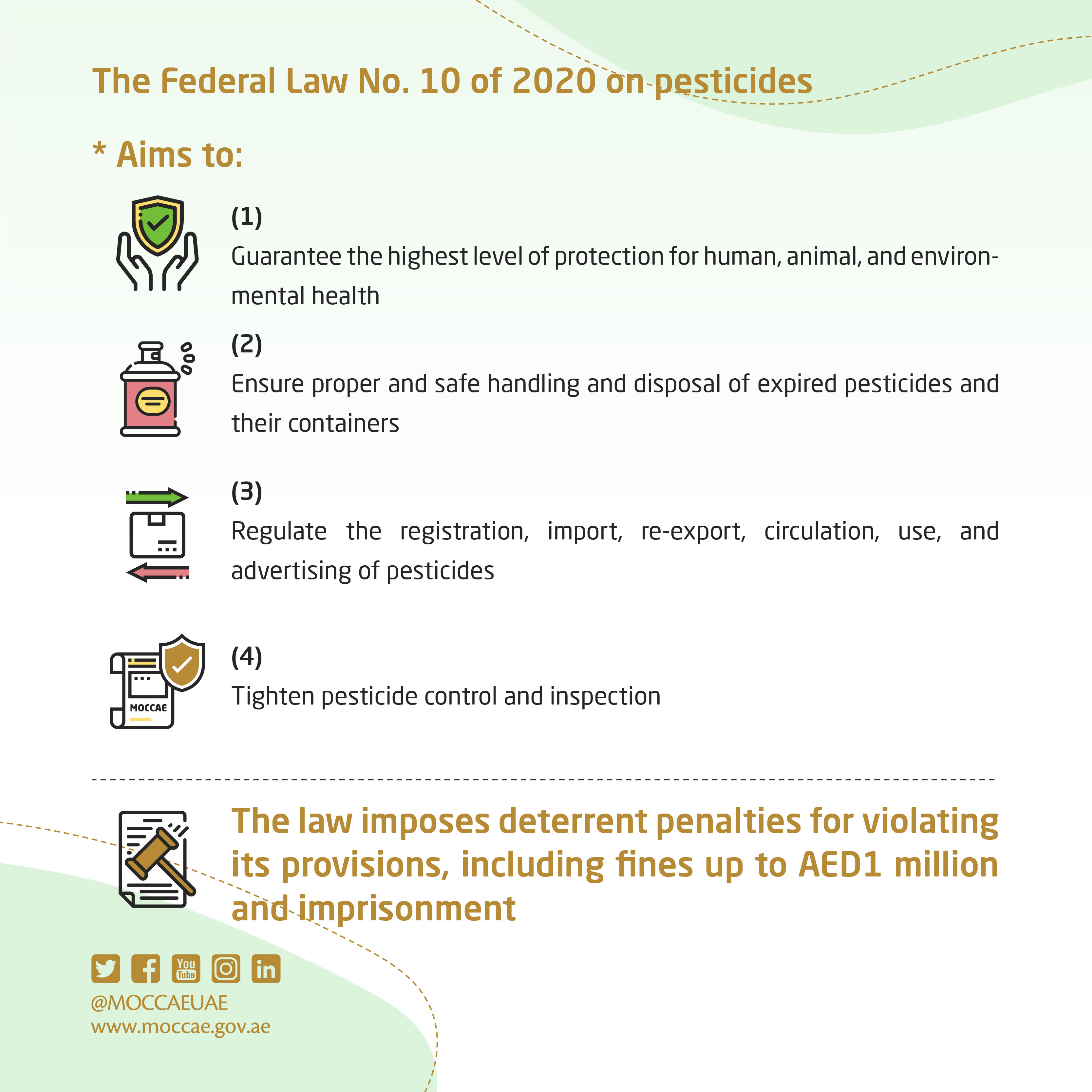 وأشار إلى أن الإجراءات التي عملت عليها الوزارة في هذا الخصوص يأتي في مقدمتها إعداد تشريعات وقوانين منظمة لعمليات تسجيل واستيراد وإعادة تصدير وتسويق وبيع وإعادة استخدام المبيدات، ومنها القانون الاتحادي رقم 10 لسنة 2020 في شأن المبيدات.