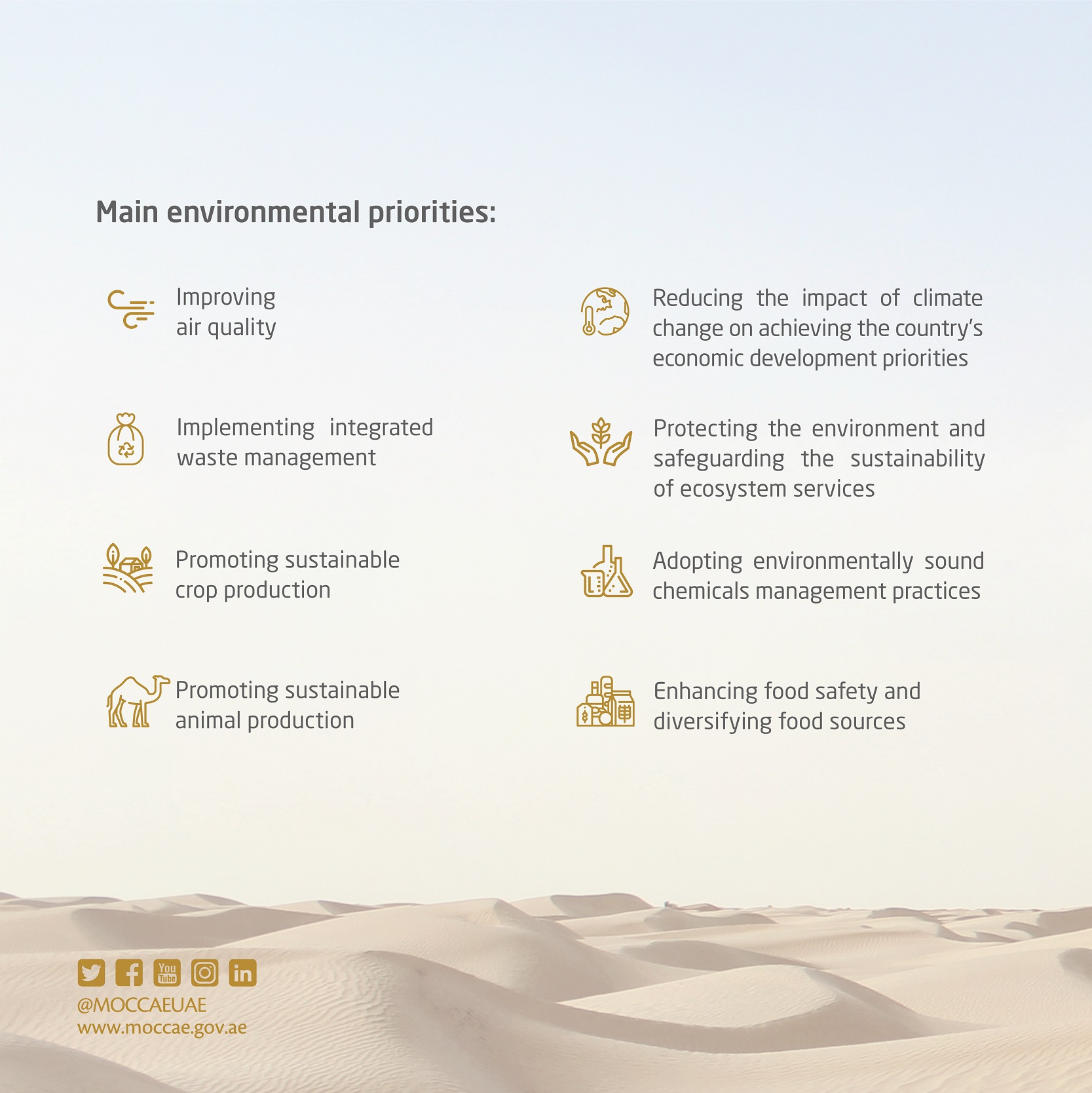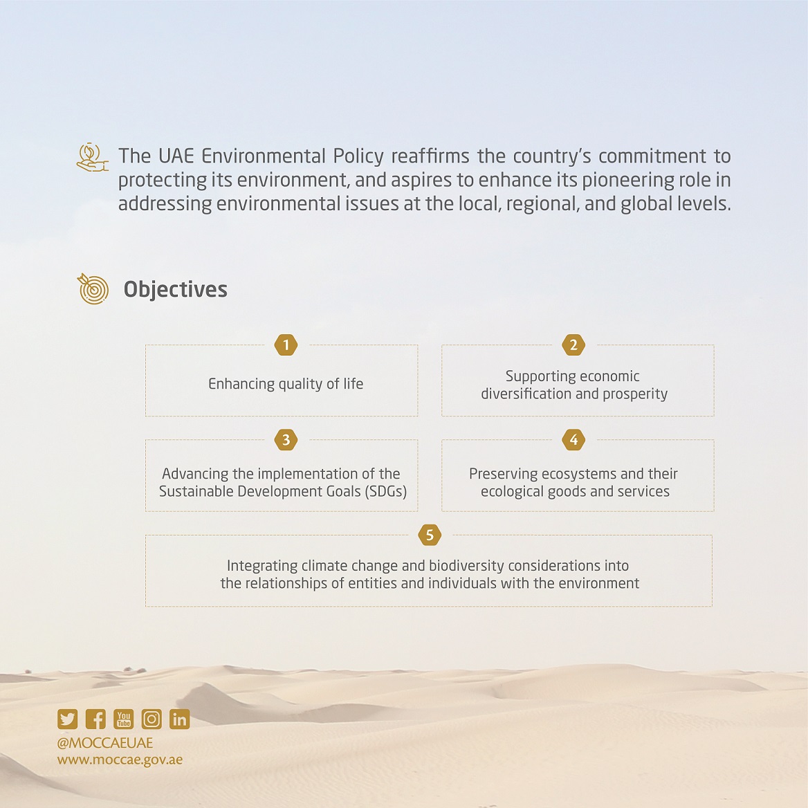 و تهدف السياسة العامة للبيئة في دولة الإمارات إلى تعزيز جودة الحياة في الدولة، حاضراً ومستقبلاً مع التركيز على الحفاظ على بيئة مستدامة تدعم النمو الاقتصادي على المدى الطويل. وتركز على المحافظة على التنوع البيولوجي المحلي، واستدامة الموارد الطبيعية والنظم الايكولوجية المحلية وخدماتها، ودمج اعتبارات وأهداف حماية البيئة والعمل المناخي في سياسات وخطط القطاعات المختلفة في الدولة. بالإضافة إلى تعزيز مساهمة قطاع الثروة الحيوانية والقطاع الزراعي في الاقتصاد الوطني والتنوع الغذائي، بما يدعم جهود تحقيق أهداف التنمية المستدامة 2030.
