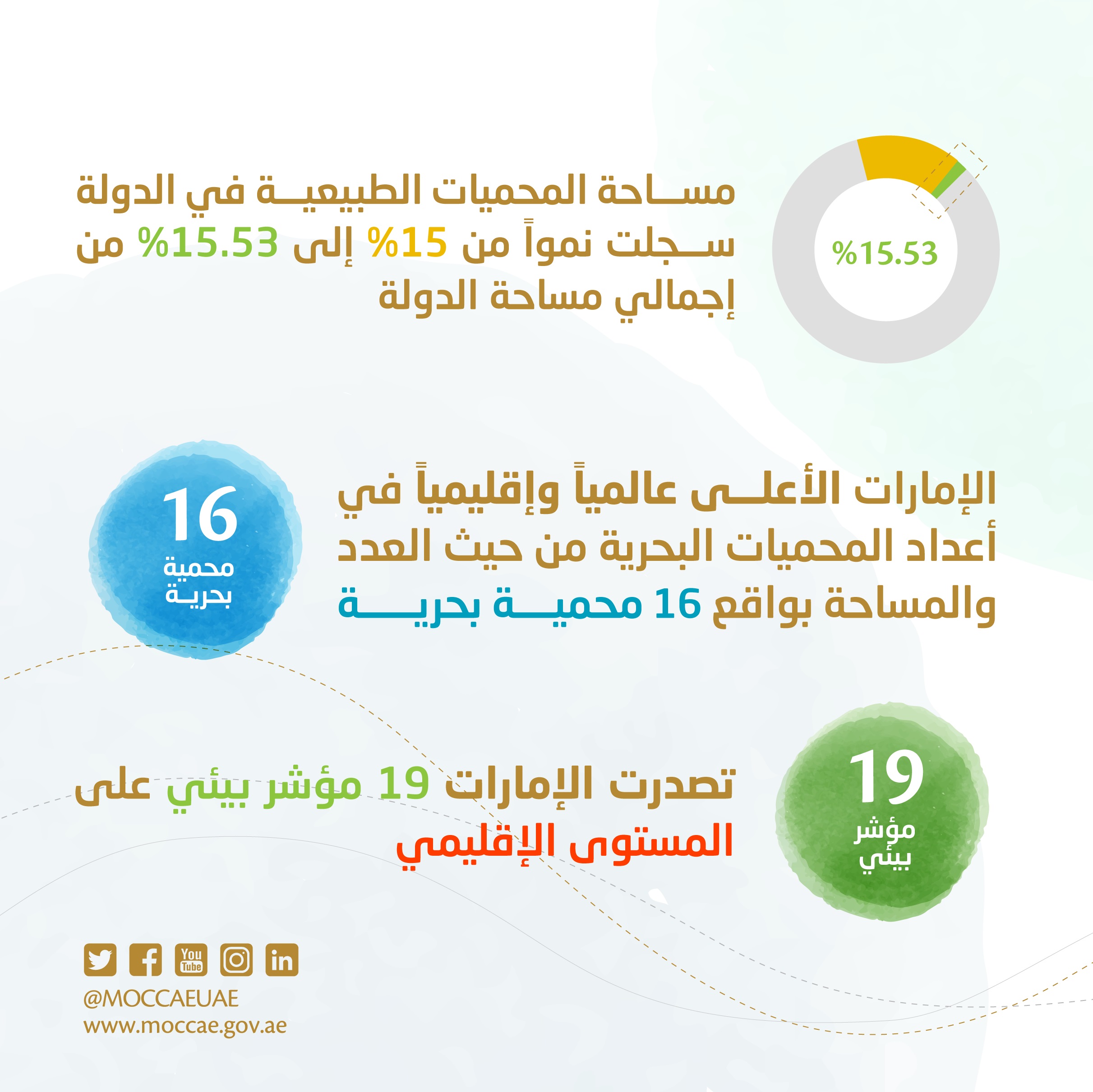 وفي مؤشر الأداء البيئي تصدرت الإمارات المشهد الدولي في مجموعة من المؤشرات التابعة له تشمل، مؤشر كثافة انبعاثات ثاني أكسيد الكبريت، ويقيس المؤشر في هذه الفئة معدل النمو والتراجع في انبعاثات ثاني أكسيد الكبريت ومتوسط المعدل السنوي للزيادة أو النقصان على مر السنين، وطبيعة التعديل عليه وفقاً للاتجاهات الاقتصادية، ومؤشر المحميات البحرية ويقيس هذا المؤشر مساحة المحميات البحرية من اجمالي مساحة الدولة، وحافظت دولة الإمارات على تصدرها العالمي والعربي لفئة المحميات البحرية حيث تمتلك الدولي 16 منطقة محمية بحرية. وارتفعت نسبة المساحة الإجمالية للمحميات الطبيعية في الدولة من 15.07 بالمئة خلال عام 2019 إلى 15.53بالمئة في عام 2020 من إجمالي مساحة الدولة، إضافة إلى ارتفاع مساحة المحميات البرية من 17.1 بالمئة إلى 18.4 بالمئة في عام 2020، فيما وصلت نسبة مساحة المحميات البحرية إلى 12.01 بالمئة، ومؤشر "الوقود الصلب المنزلي" والذي يقيس نسبة استخدام المواد الصلبة المستخدمة كوقود لإنتاج الطاقة وتوفير التدفئة، وتصدرت الدولة هذا المؤشر لأنه لا يتم استخدام الوقود الصلب لإنتاج الطاقة والتدفئة في المنازل.