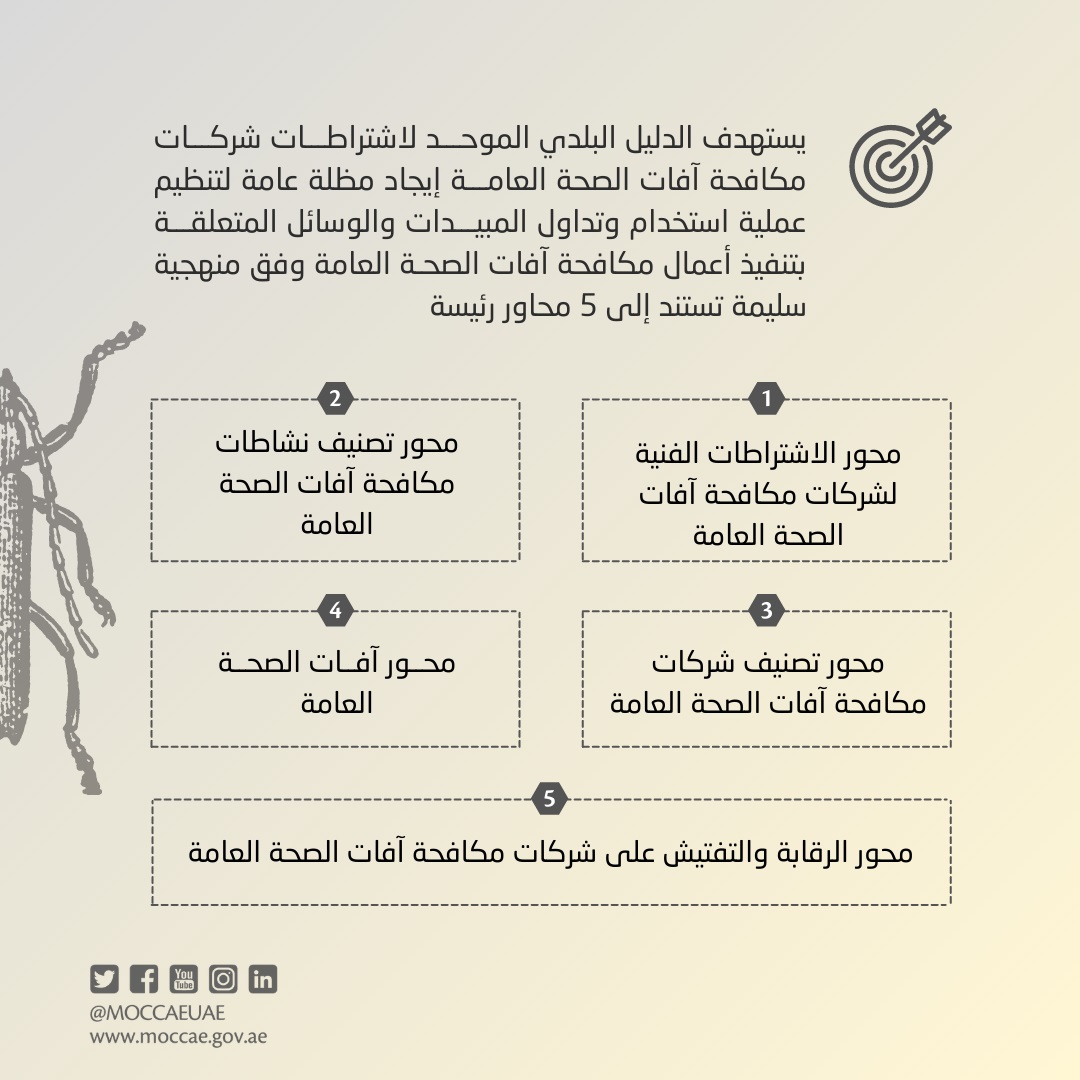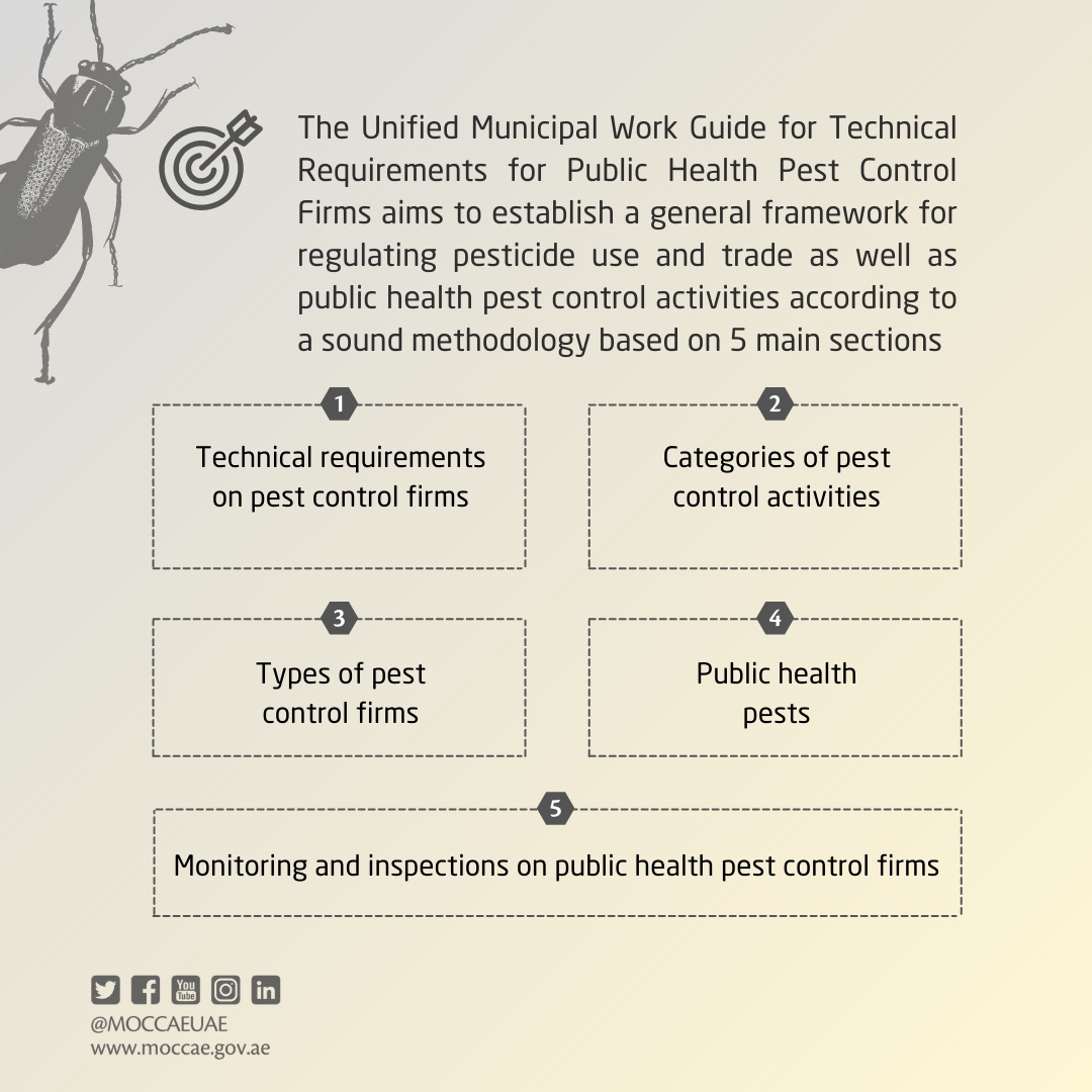 ويتناول الدليل في محور الاشتراطات الفنية لشركات مكافحة آفات الصحة العامة المتطلبات والإجراءات المعززة للحد من الممارسات الخاطئة، 6 بنود رئيسية، الأول يختص بمتطلبات ترخيص النشاط والتي تمنع ضمن نقاطها مزاولة أعمال مكافحة آفات الصحة العامة دون الحصول على ترخيص من الجهة المعنية، ومزاولة الأعمال دون وجود فني متخصص يتولى الاشراف على كافة العمليات الفنية، وممارسة أي عامل للنشاط دون اجتيازه لاختبار كفاءة وحصوله على تصريح رسمي، كما تشترط على الشركات العاملة في المجال تقديم سجلات وتقارير دورية بالمبيدات المستخدمة.