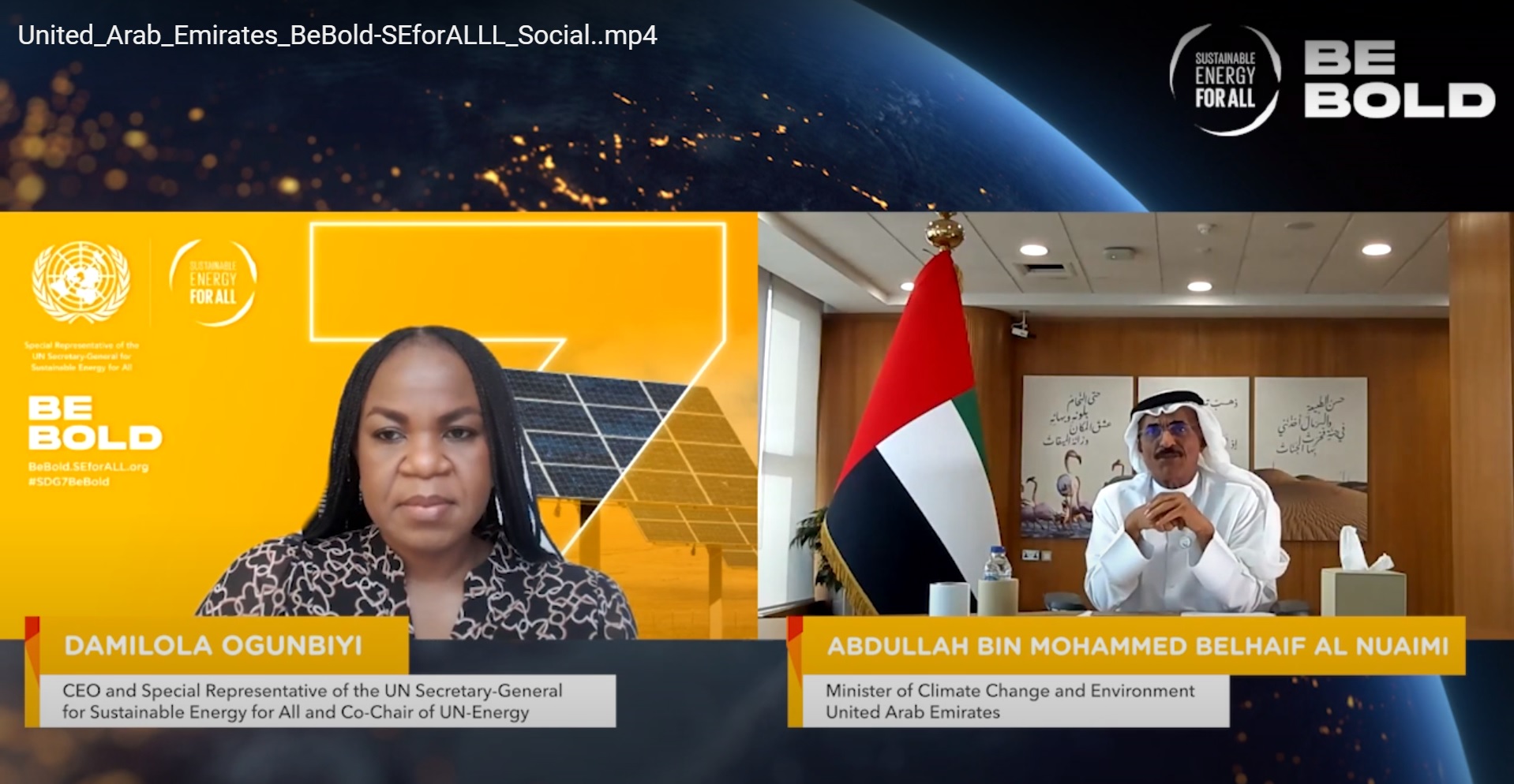 ناقش معالي الدكتور عبدالله بلحيف النعيمي ، وزير التغير المناخي والبيئة، سبل رفع الطموح بشأن هدف التنمية المستدامة 7: طاقة نظيفة وبأسعار معقولة، خلال مشاركته في حوار افتراضي ضمن الحملة العالمية للطاقة النظيفة " Be Bold "، مع دميلولا أوغونبي ، الرئيس التنفيذي والممثل الخاص للأمين العام للأمم المتحدة للطاقة المستدامة للجميع (SEforALL) والرئيس المشارك للأمم المتحدة للطاقة.