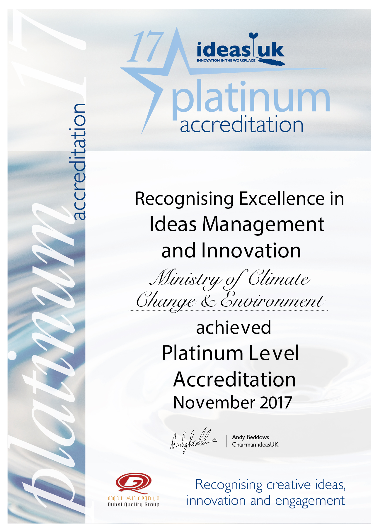 وزارة التغير المناخي والبيئة تحصل على الاعتماد البلاتيني من مؤسسة أفكار المملكة المتحدة عن كفاءة نظام إدارة الابتكار المؤسسي