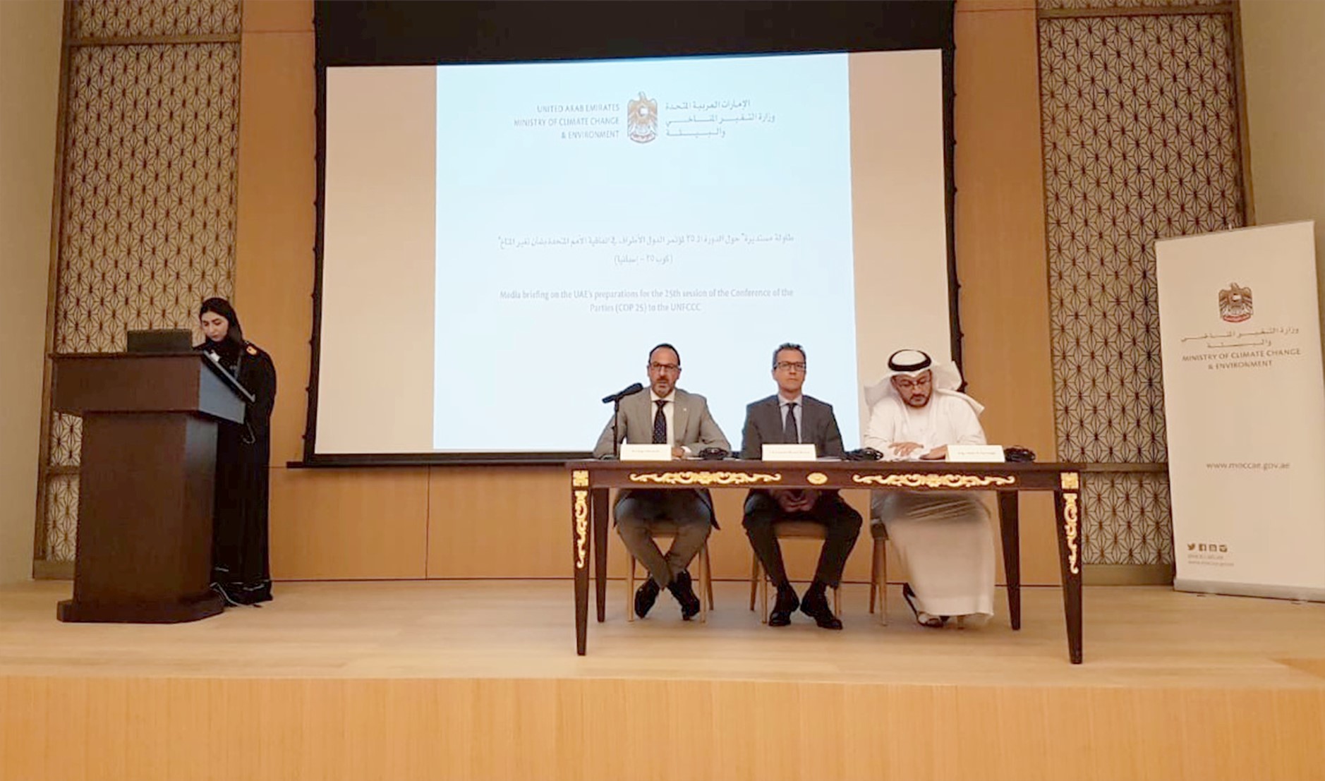 نظمت وزارة التغير المناخي والبيئة بالتعاون مع سفارتي مملكة إسبانيا، وجمهورية تشيلي في دولة الإمارات، اجتماع "طاولة مستديرة" اليوم الأربعاء في ديوانها في أبوظبي للتعريف بأعمال الدورة الـ 25 من مؤتمر دول الأطراف في اتفاقية الأمم المتحدة بشأن تغير المناخ "كوب 25"، وطبيعة مشاركة الإمارات والنقاط التي سيتم التركيز عليها وطرحها عبر وفد الدولة المشارك.
