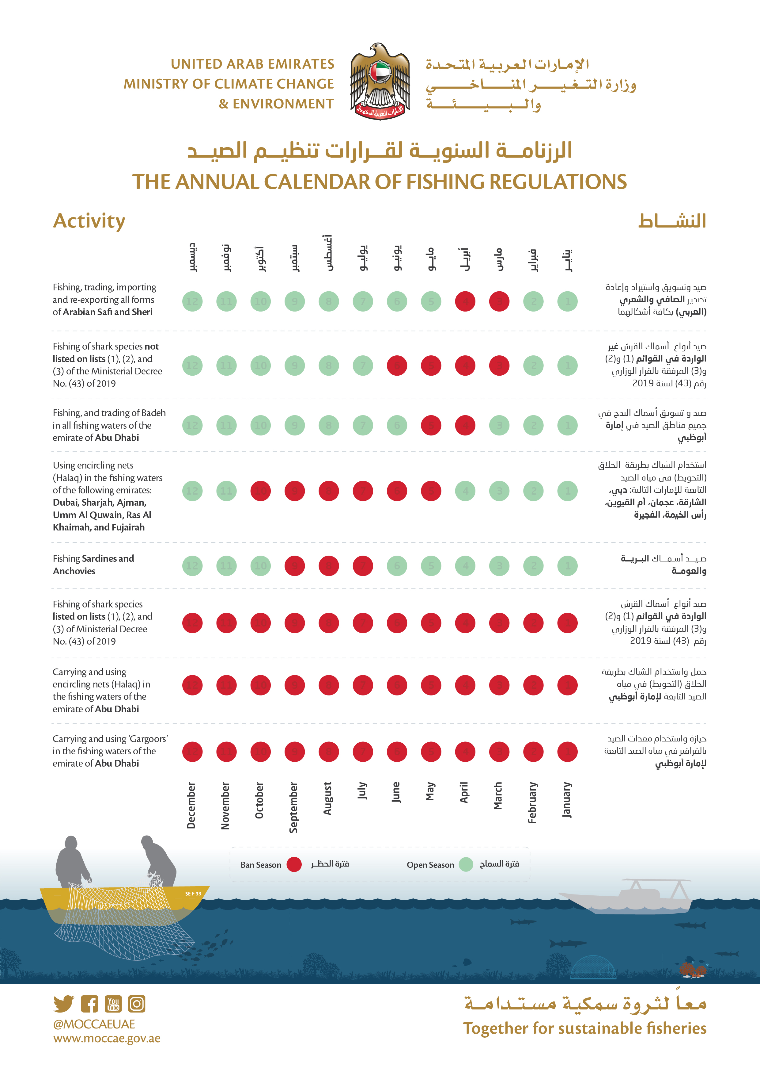وتعمل الوزارة مع شركاؤها الاستراتيجيين من السلطات الاتحادية والمحلية، والسلطات البيئية المختصة وجمعيات الصيادين على تطبيق القرارين الوزاريين ورفع مستوى الوعي عند جميع الفئات المعنية بأهمية منع الصيد خلال موسم التكاثر والمحافظة على استدامة الثروة السمكية وزيادة مخزونها في مياه الدولة.