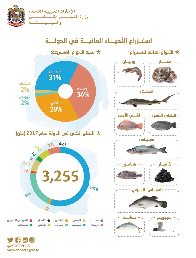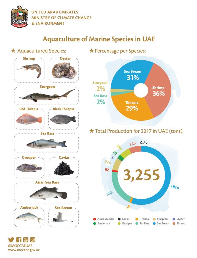 ويشار إلى أن الطاقة الإنتاجية لقطاع استزراع الأحياء المائية بالدولة بلغت 3,255 طن في عام 2017، ويتركز الإنتاج التجاري على استزراع 7 أنواع من الأحياء المائية هي: سمك الهامور، البارامندي، البلطي، الروبيان، السبريم، السيباس، وأسماك الحفش وأنواع أخرى من القشريات والرخويات. كما نجحت إدارة أبحاث البيئة البحرية في استزراع أنواع عديدة أخرى من الأحياء المائية، مثل السبيطي، والصافي، والشعري، والبياح، والقابط، والشعم.