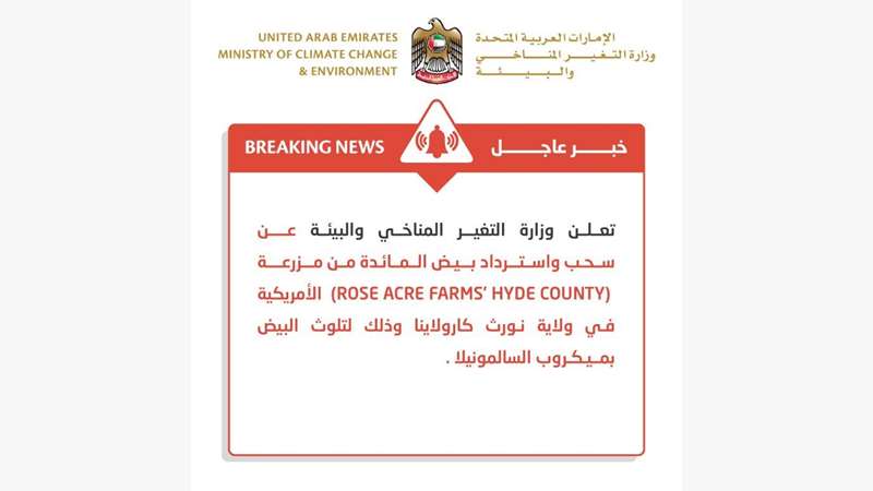 انطلاقاً من حرصها على ضمان غذاء سليم وآمن للمستهلكين في الدولة، قامت وزارة التغير المناخي والبيئة باتخاذ جملة من الإجراءات الاحترازية على استيراد بيض المائدة من إحدى المزارع في ولاية كارولاينا الشمالية الأمريكية، وذلك متابعةً للمعلومات الفنية الواردة للوزارة بشأن قيام هيئة الغذاء والدواء الأمريكية (FDA) ومركز الرقابة والوقاية من الأمراض (CDC) برصد 23 إصابة بحالات تسمم غذائي في 9 ولايات أمريكية، ست حالات منها فقط احتاجت عناية طبية، حيث أشارت نتائج التحري إلى تناول المصابين لبيض مائدة ملوث بميكروب السالمونيلا وأن مصدره مزرعة (Rose Acre Farms) الواقعة في ولاية كارولاينا الشمالية، مما حذى بالمزرعة إلى سحب واسترداد ما يزيد عن 200 مليون بيضة تم توزيعها على 9 ولايات أمريكية بالإضافة إلى 9 دول بما فيها دولة الإمارات العربية المتحدة، مشيرة إلى أنها تتواصل مع المنظمات الإقليمية والعالمية والهيئات الدولية للإشراف على عملية السحب والاسترداد.