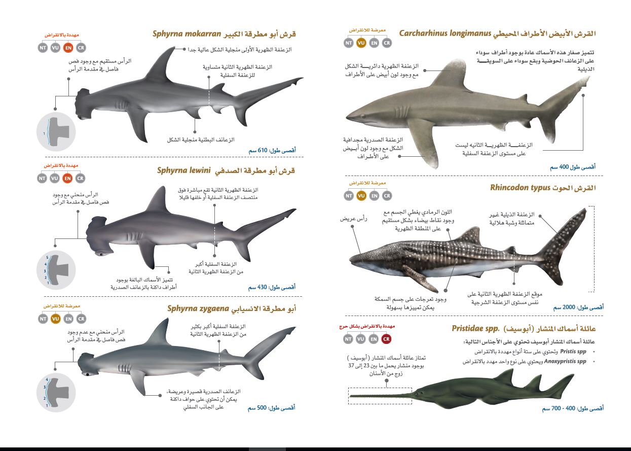 وفي حالة استيراد أنواع أسماك القرش الواردة في ملاحق اتفاقي «سايتس» ــ المذكورة في القائمة المرفقة بالقرار ــ وهي: أبوسيف (أبومنشار)، القرش الحوت، القرش أبومطرقة الكبير، القرش أبومطرقة الصدفي، القرش أبومطرقة الانسيابي، القرش أبيض الأطراف المحيطي، القرش البوربيجل، القرش المتشمس، القرش الأبيض، شيطان البحر المحيطي الضخم، فإنه يلزم إرفاق مستندات إضافية، هي: شهادة تصدير أو إعادة تصدير من السلطة الإدارية في الدولة المصدرة، وشهادة استيراد سارية الصلاحية صادرة عن وزارة البيئة والمياه، ولا يجوز للشركات تصدير أسماك القرش التي تصاد في مياه الصيد بالدولة، سواء كانت طازجة أو مجمدة أو مجففة أو مملحة أو مدخنة أو معلبة أو بأي شكل آخر طوال العام.