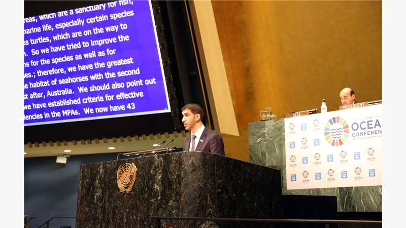 ترأس معالي الدكتور ثاني بن أحمد الزيودي وزير التغير المناخي والبيئة وفد دولة الإمارات المشارك في مؤتمر المحيطات المقام في نيويورك من 5 وحتى 9 من الشهر الجاري. وألقى الدكتور الزيودي كلمة الدولة التي أكّد فيها على أن البيئة البحرية ظلّت هي البيئة الأهم بدولة الإمارات العربية المتحدة، فقد لعبت دوراً هاماً في حياتنا، وكانت نافذتنا على العالم الخارجي وصلة الوصل الرئيسية به، ومصدر الرزق الرئيسي لشريحة واسعة من السكان الذي اعتمدوا في معيشتهم على صيد الأسماك واللؤلؤ. وأضاف معاليه أن اكتشاف النفط في النصف الثاني من القرن العشرين أكسب بيئتنا البحرية المزيد من الأهمية نتيجة لتحولها إلى قاعدة لثروات اقتصادية هامة، علاوة على ما تضمه من تنوع بيولوجي غني، وما توفره من خدمات في مجال النقل وتحلية المياه والسياحة والترفيه وغيرها.