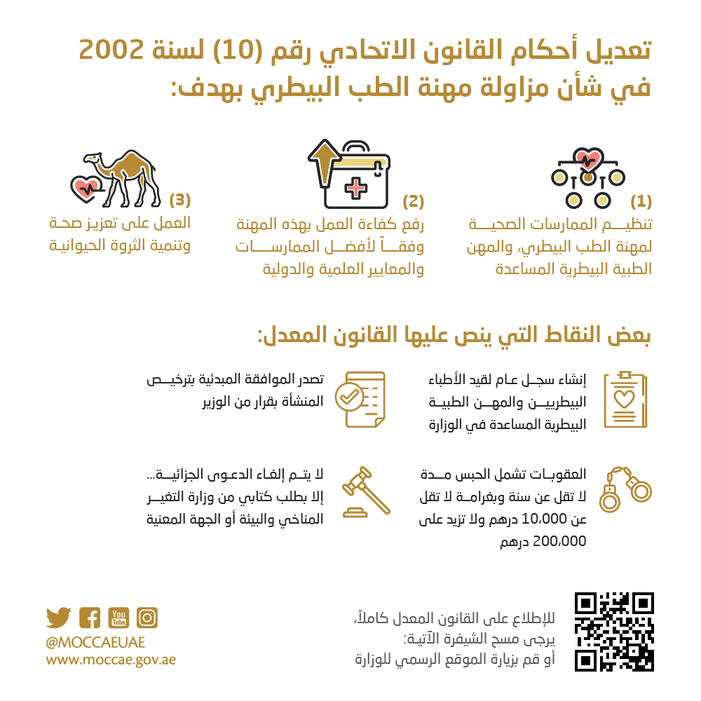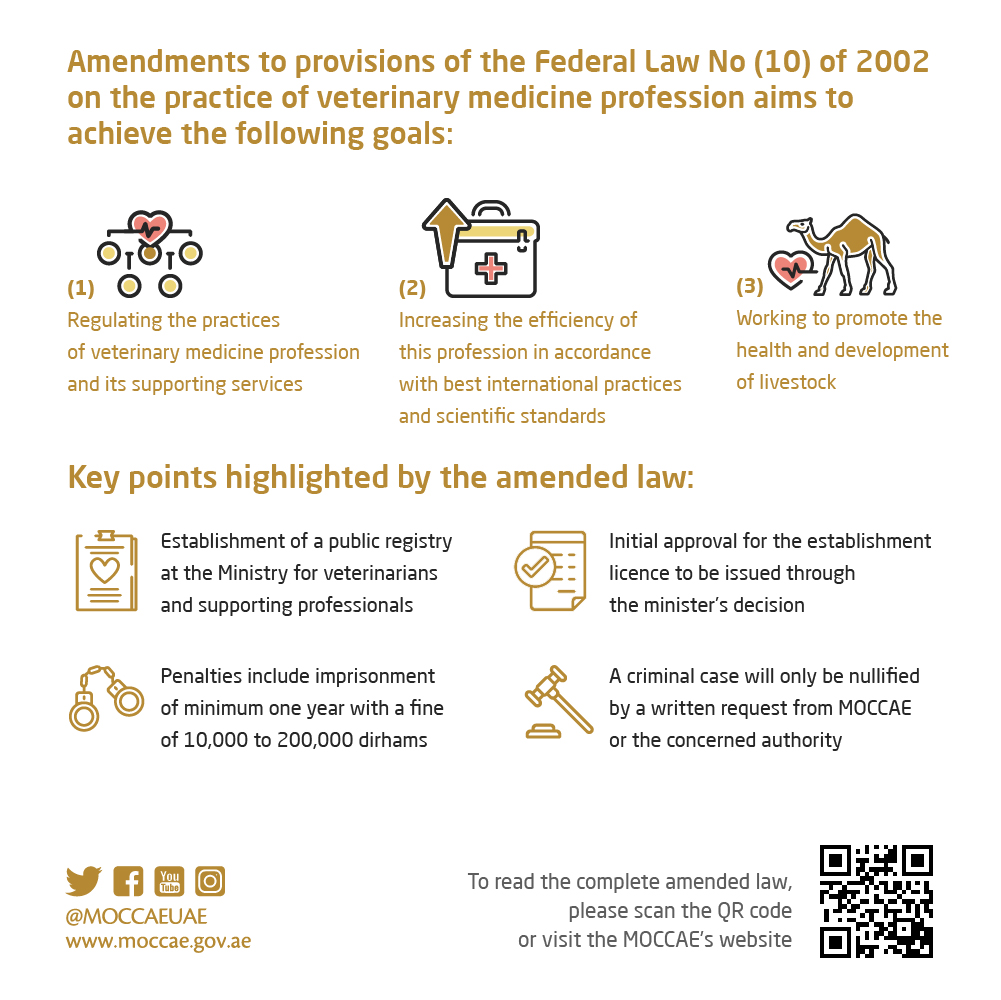 أصدر صاحب السمو الشيخ خليفة بن زايد آل نهيان رئيس الدولة حفظه الله القانون الاتحادي رقم (8) لسنة 2017 بتعديل بعض أحكام القانون الاتحادي رقم (10) لسنة 2002 في شأن مزاولة مهنة الطب البيطري والذي يهدف إلى تنظيم الممارسات الصحية لمهنة الطب البيطري، والمهن الطبية البيطرية المساعدة ورفع كفاءة العمل بهذه المهنة وفقا لأفضل الممارسات والمعايير العلمية والدولية في ضوء التشريعات المعمول بها للعمل على تعزيز صحة وتنمية الثروة الحيوانية في الدولة طبقاً لأفضل الممارسات والمعايير العلمية والدولية وبما يتوافق مع النظام الخليجي لمزاولة مهنة الطب البيطري.
