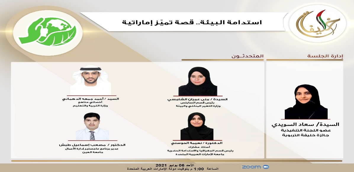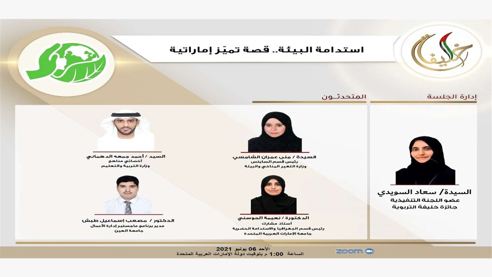 On the occasion of World Environment Day, the Ministry participated in the dialogue session on environmental sustainability, as an example of an Emirati story of excellence, where the engineer, Mona Al Shamsi, sensitized the community members about the vision and thought of the late founding leader Sheikh Zayed bin Sultan Al Nahyan, may God rest his soul, in preserving and protecting the environment, preserving natural resources and wildlife, and the most important pillars The approach of the founding father, the late Sheikh Zayed, had his insightful and far-reaching vision in this field, not only from an environmental perspective, but also because these endangered species form an integral part of the national identity of every individual.