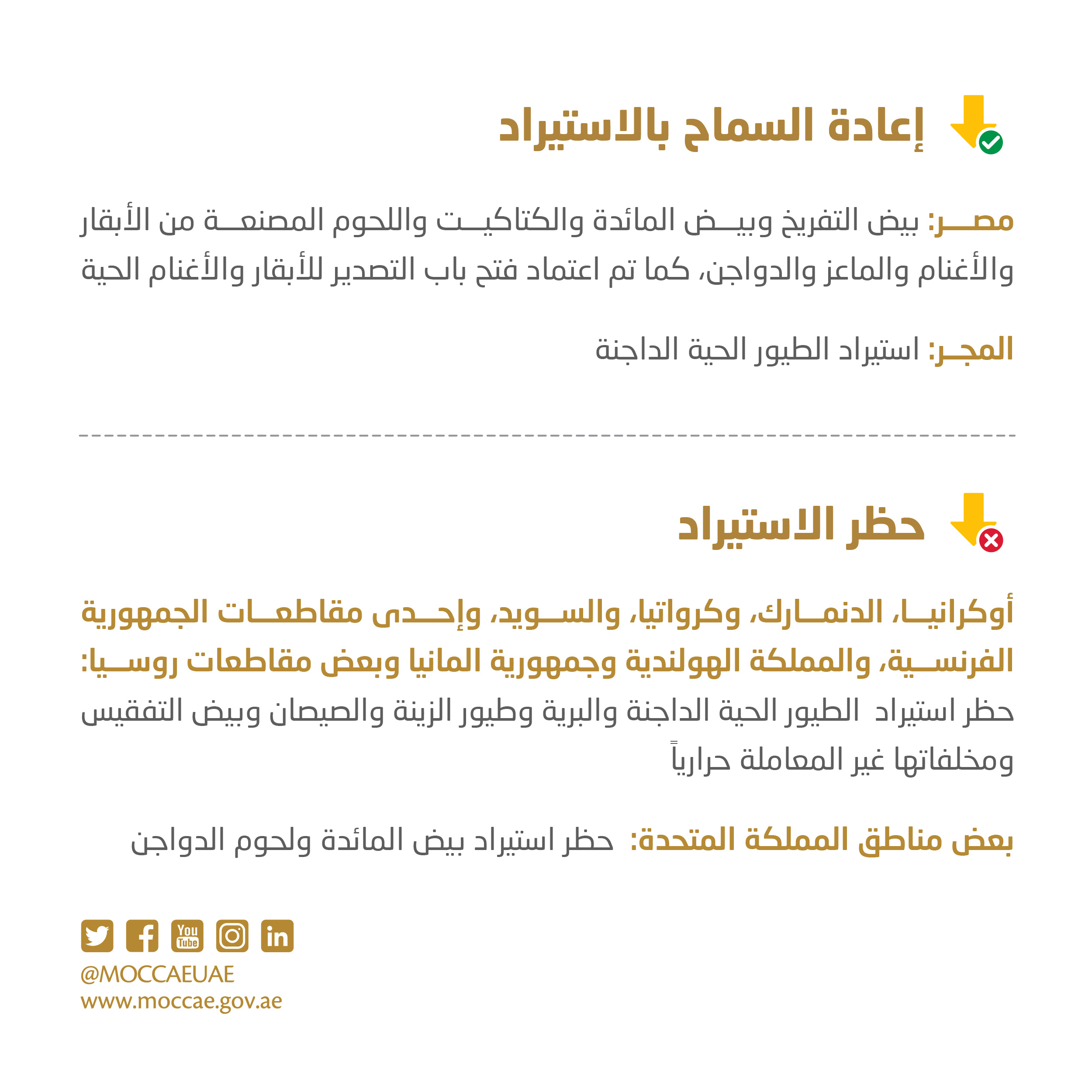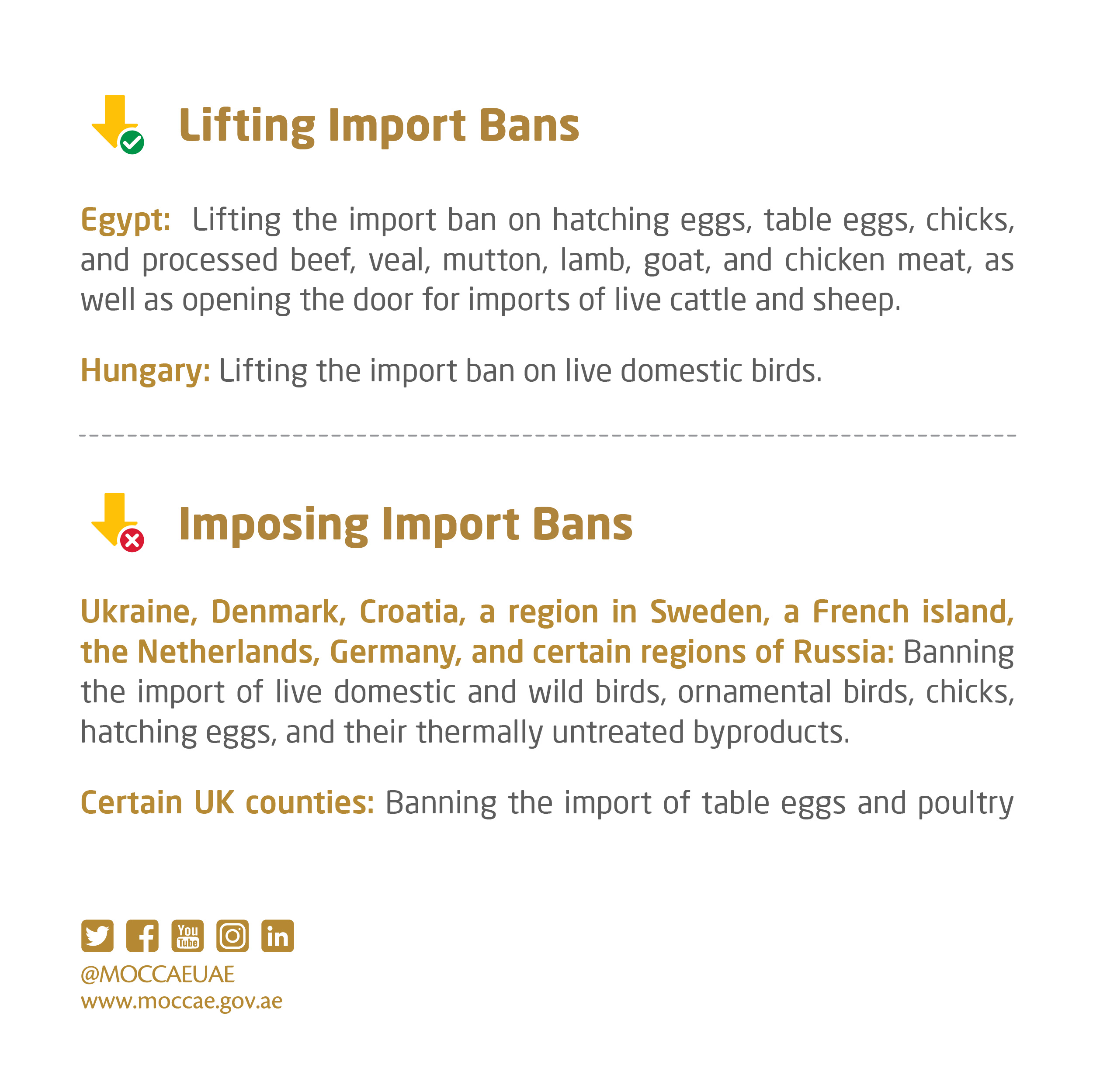 On the other hand, MOCCAE has issued nine resolutions banning the import of birds and their byproducts from areas that recorded outbreaks of highly pathogenic avian influenza during November and December 2020 as per notifications from OIE.