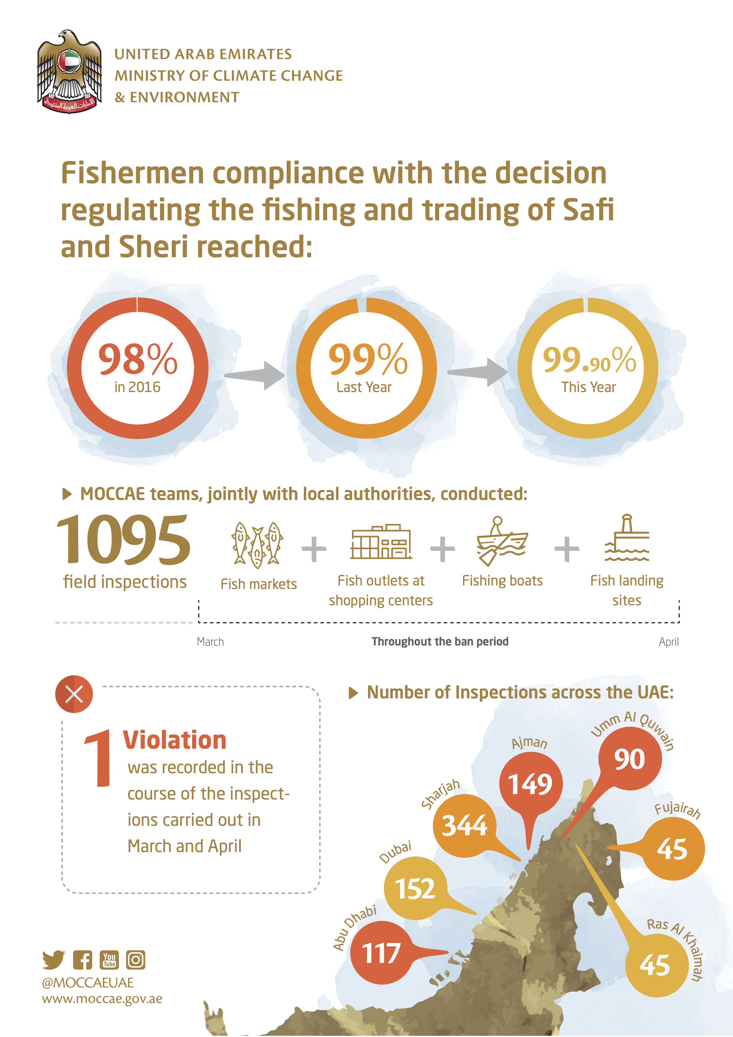 The Ministry of Climate Change and Environment (MOCCAE) confirmed 99.9 percent compliance of fishermen with the Ministerial Decision No. 501 of 2015 on the regulation of fishing and trading of Arabian sheri (emperor fish) and safi (rabbitfish) during the breeding season, from March 1 to April 30, 2018.