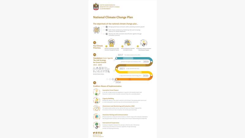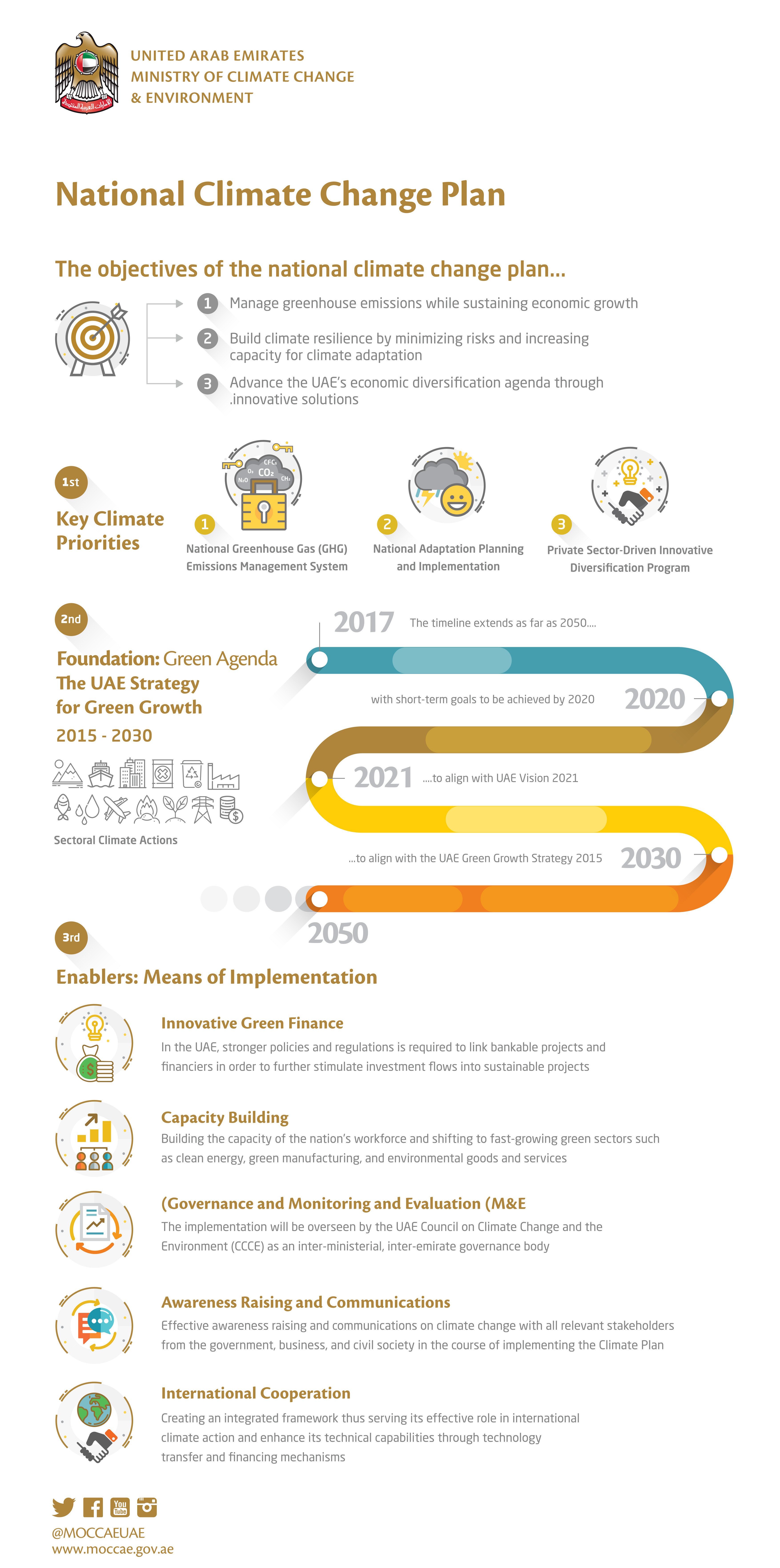 The implementation of the National Climate Change Plan will be overseen by the UAE Council on Climate Change and the Environment (CCCE) as an inter-ministerial, inter-emirate governance body. The Ministry of Climate Change and Environment (MOCCAE) will assume the role of the secretariat. In addition, MOCCAE will also take on the primary responsibility for monitoring the progress of the Plan.