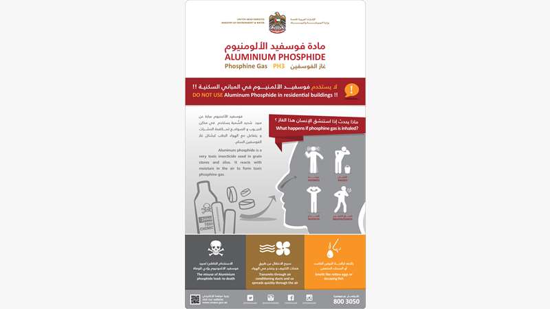 Eng. Othaibah Alqaydi - Director of Chemicals Department at MOEW stated that, “Aluminum Phosphide is banned by MoEW, and individuals should not use this pesticide to eradicate pests in residential and commercial areas as it is highly poisonous and could lead to intoxication and fatality.” She added that any violators using the pesticide could face prosecution.