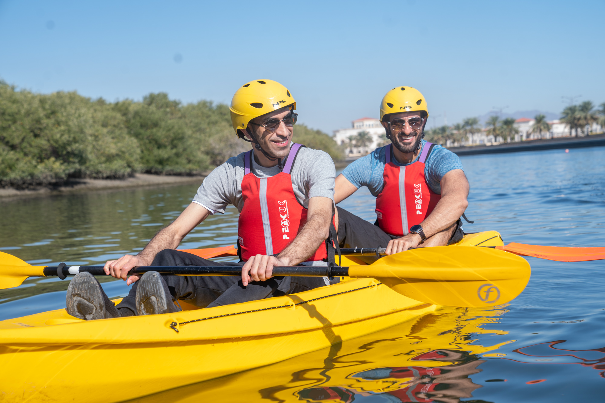 The participants engaged in several outdoor activities, such as off-road biking, high-rope climbing, hiking, kayaking, stand up paddle boarding, raft building, and mangrove exploration. They also toured Al Hefaiyah Conservation Centre and Kalba Birds of Prey Centre. The aims of these activities was to familiarize the young participants with the concept of ecotourism, raise their awareness of the critical need to protect the environment, and foster the next generation of environmental stewards.