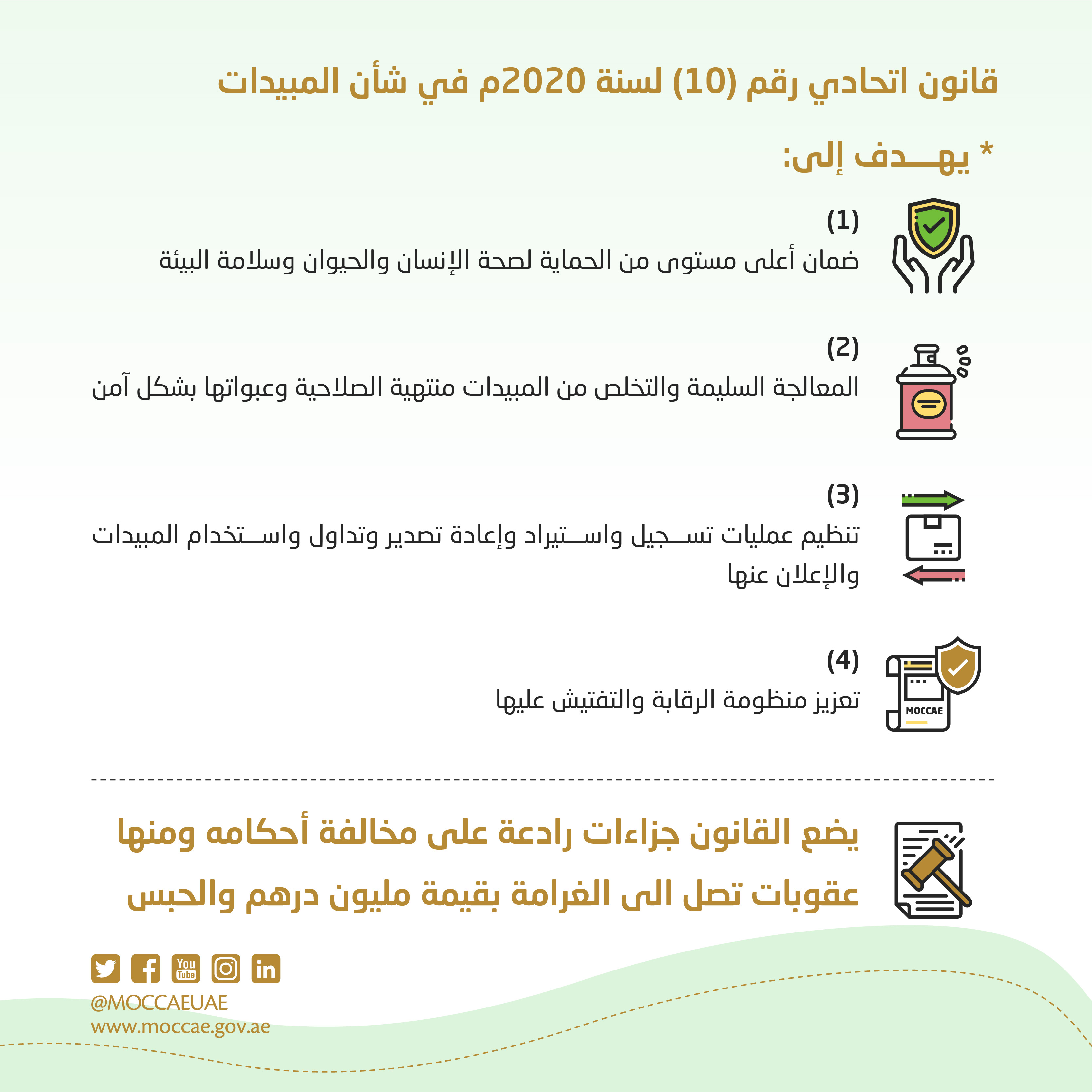 The law prohibits the manufacturing or production of any type of pesticides in the UAE unless an exception is granted from the concerned authorities. It also bans the import, re-export, and trade of damaged, adulterated, or counterfeit pesticides, as well as pesticides that are not registered with MOCCAE. Moreover, it stipulates that pesticides may not be imported or re-exported in postal packages or carried with passengers.