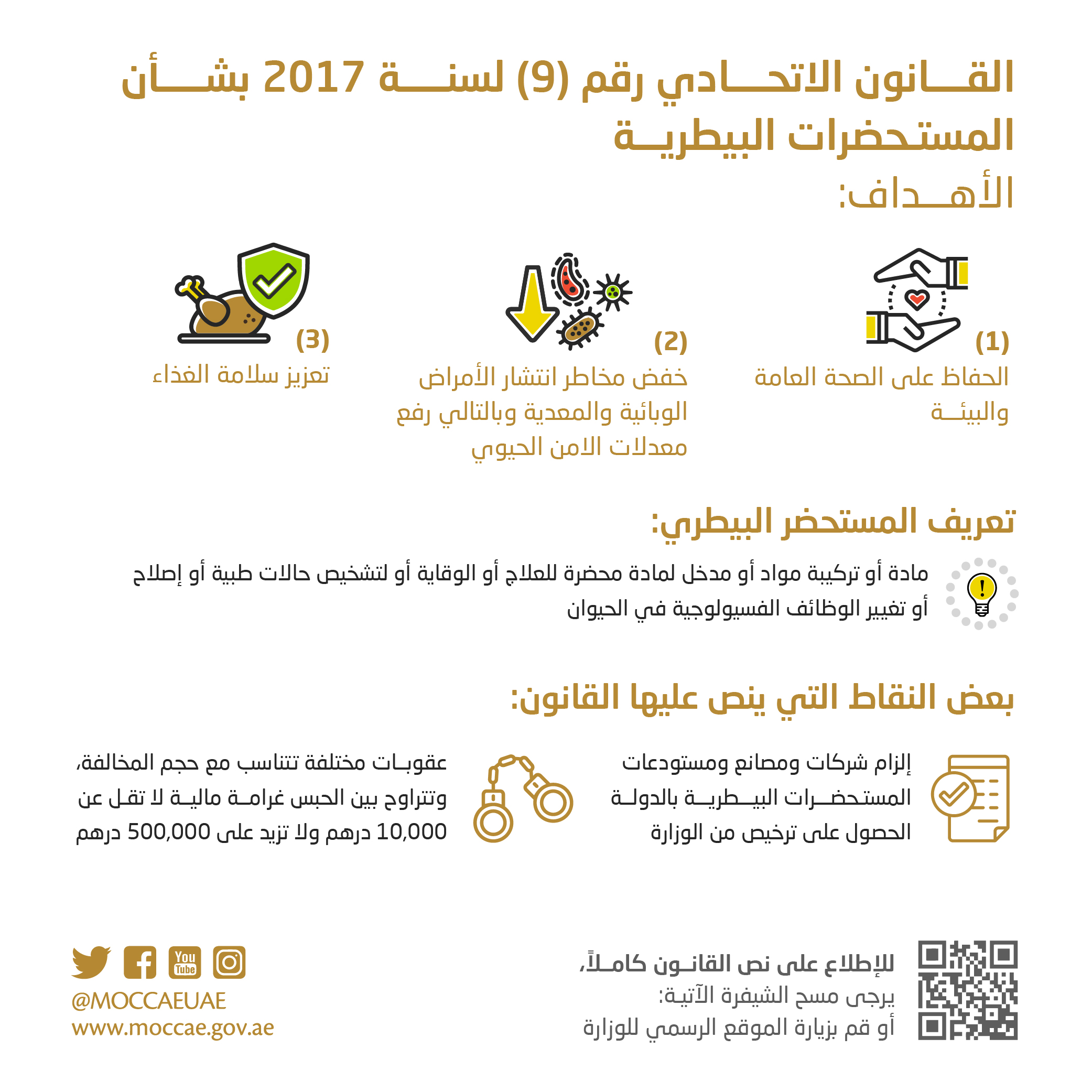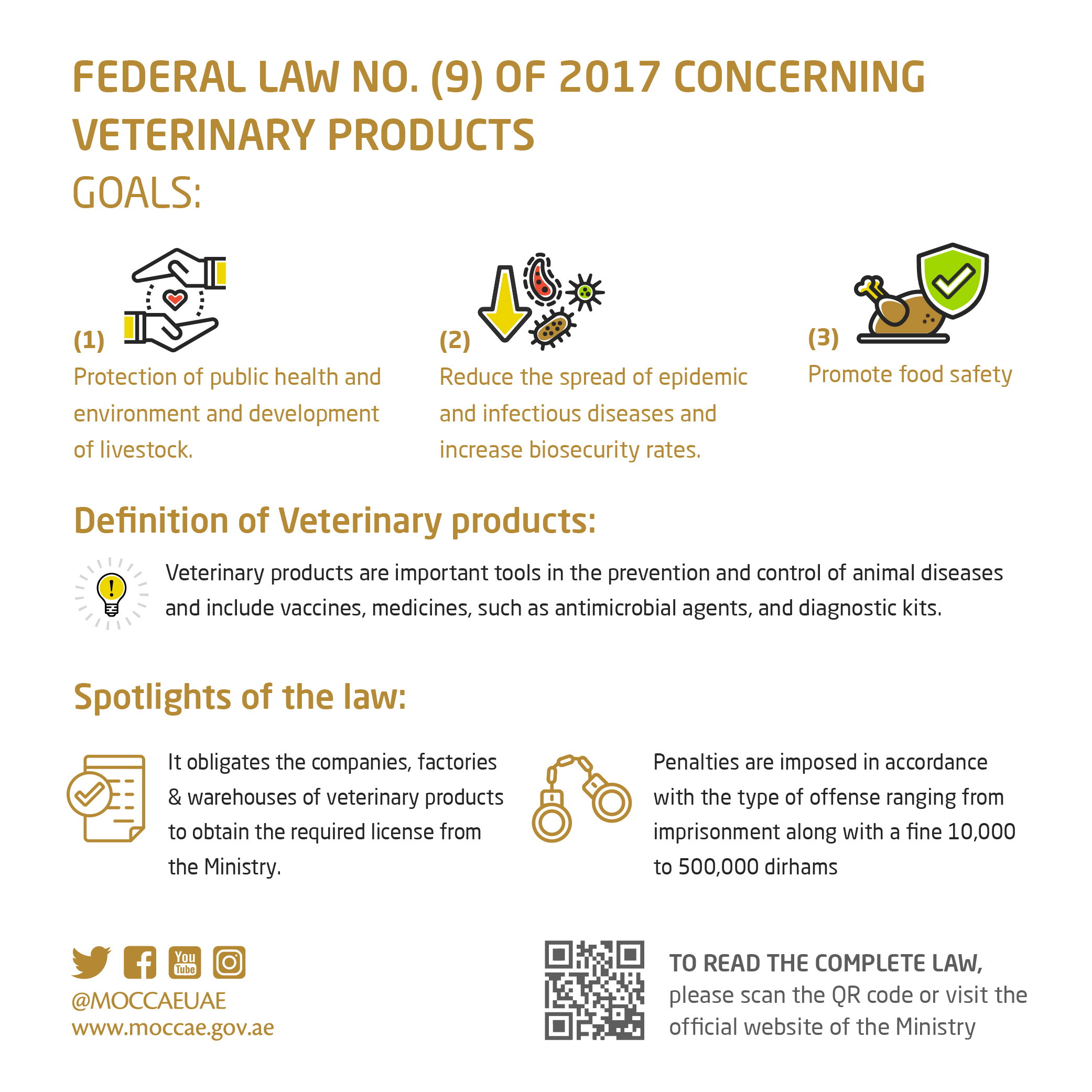 Under the law, the Ministry of Climate Change and Environment (MOCCAE) is mandated to facilitate the licensing and registration of companies and factories, as well of veterinary products, review technical reports received from international organizations or bodies on veterinary products and companies, monitor markets, receive reports from hospitals or veterinary clinics and publish lists of prohibited veterinary products.
