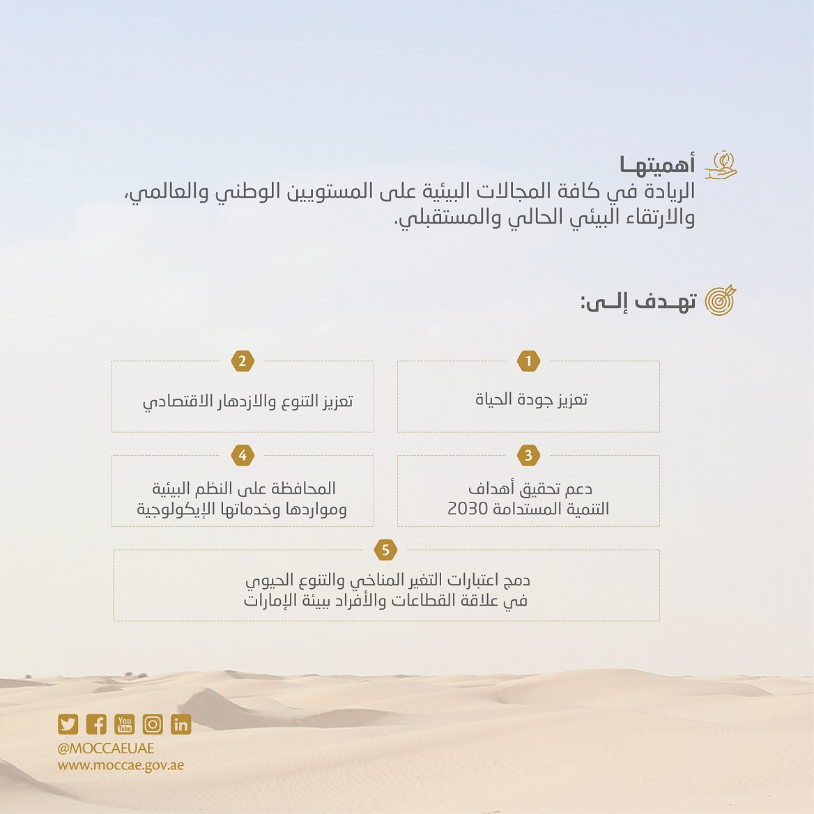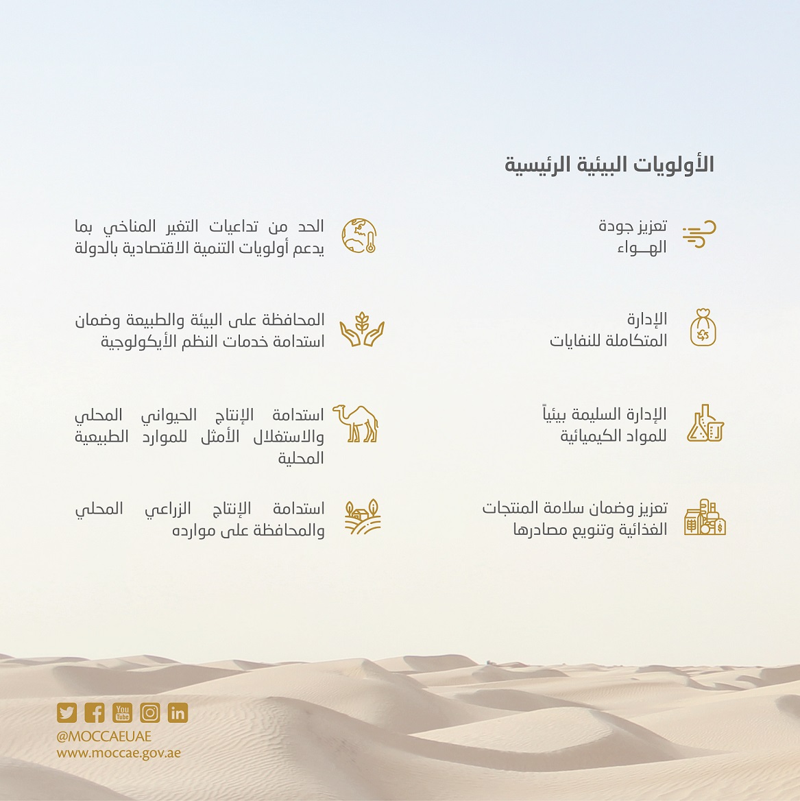 The policy is one of the essential tools that determine the UAE’s future direction in the fields of climate action and environmental protection, in addition to ensuring the implementation of the country’s relevant international obligations.