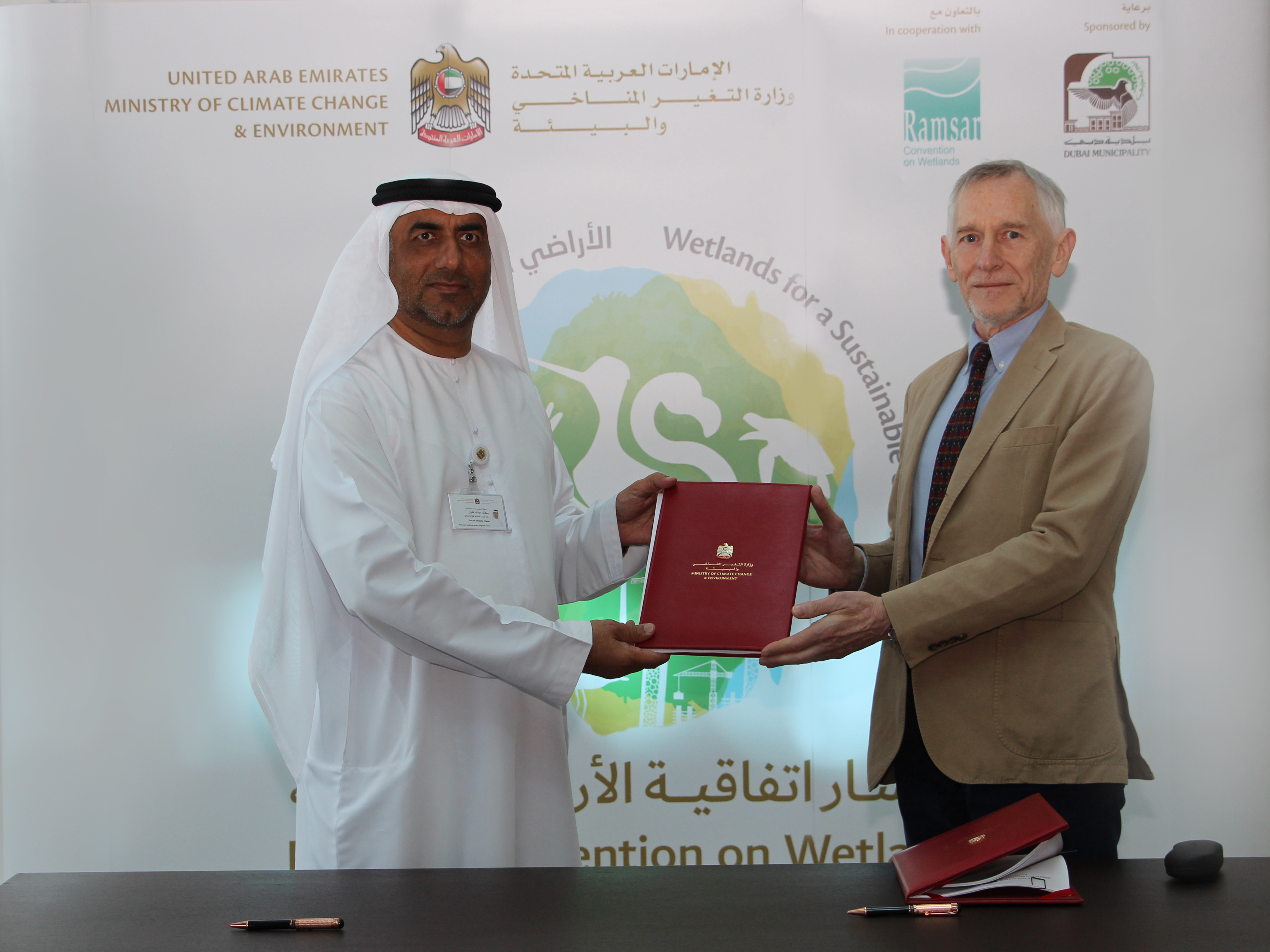 The MoU was signed by His Excellency Sultan Alwan, Assistant Undersecretary of the Regions Sector at MOCCAE, on behalf of the Ministry, and Jonathan Barzdo, Deputy Secretary General, Ramsar Convention on Wetlands, on behalf of the Secretariat.