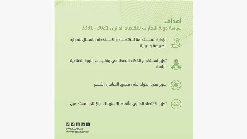 He added: “The shift to a circular economy will require concerted effort from national and local government, the private sector, and general public. Therefore, the UAE Circular Economy Policy 2021-2031 is also a call to action for all stakeholders across the board to consider how they can think and act in a more circular way to support the transition that aligns with the objectives of the UAE Centennial 2071.”