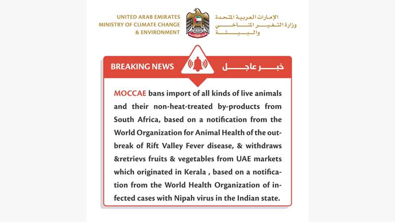 The other ban decision was based on a notification from the World Organisation for Animal Health (OIE) of the outbreak of Rift Valley Fever disease, in South Africa. The UAE Ministry of Climate Change and Environment (MOCCAE) announced that it has taken the following precautionary measures:
