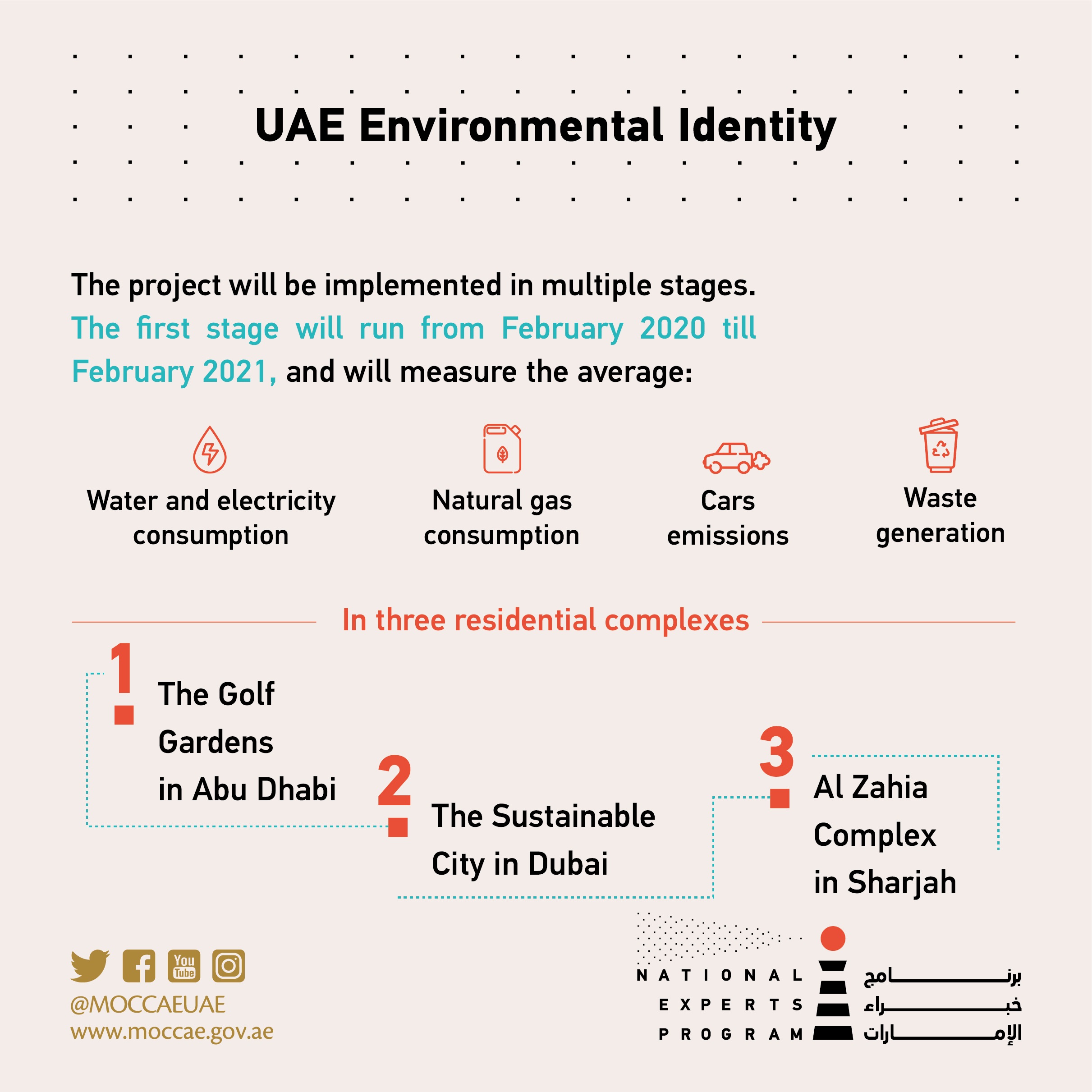 يُطبق المشروع على مجموعة من المراحل، تستمر مرحلته الأولى من فبراير الجاري وحتى فبراير 2021، وتشمل قياس نسب ومعدلات استهلاك المياه والكهرباء والغاز الطبيعي وانبعاثات السيارات وإنتاج النفايات في ثلاث مجمعات سكنية هي مجمع الجولف في أبوظبي، ومجمع المدينة المستدامة في دبي، ومجمع الزاهية في الشارقة كفترة تجريبية.