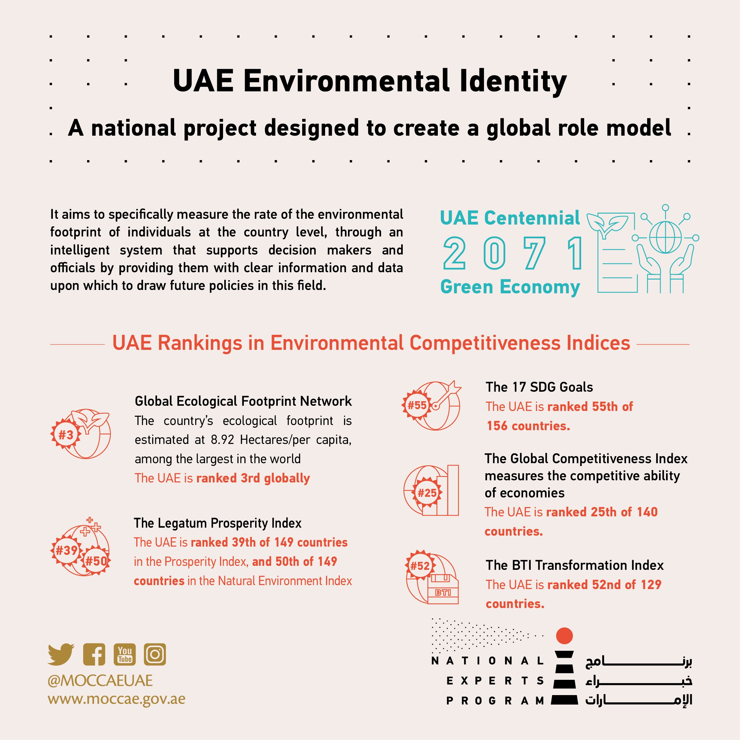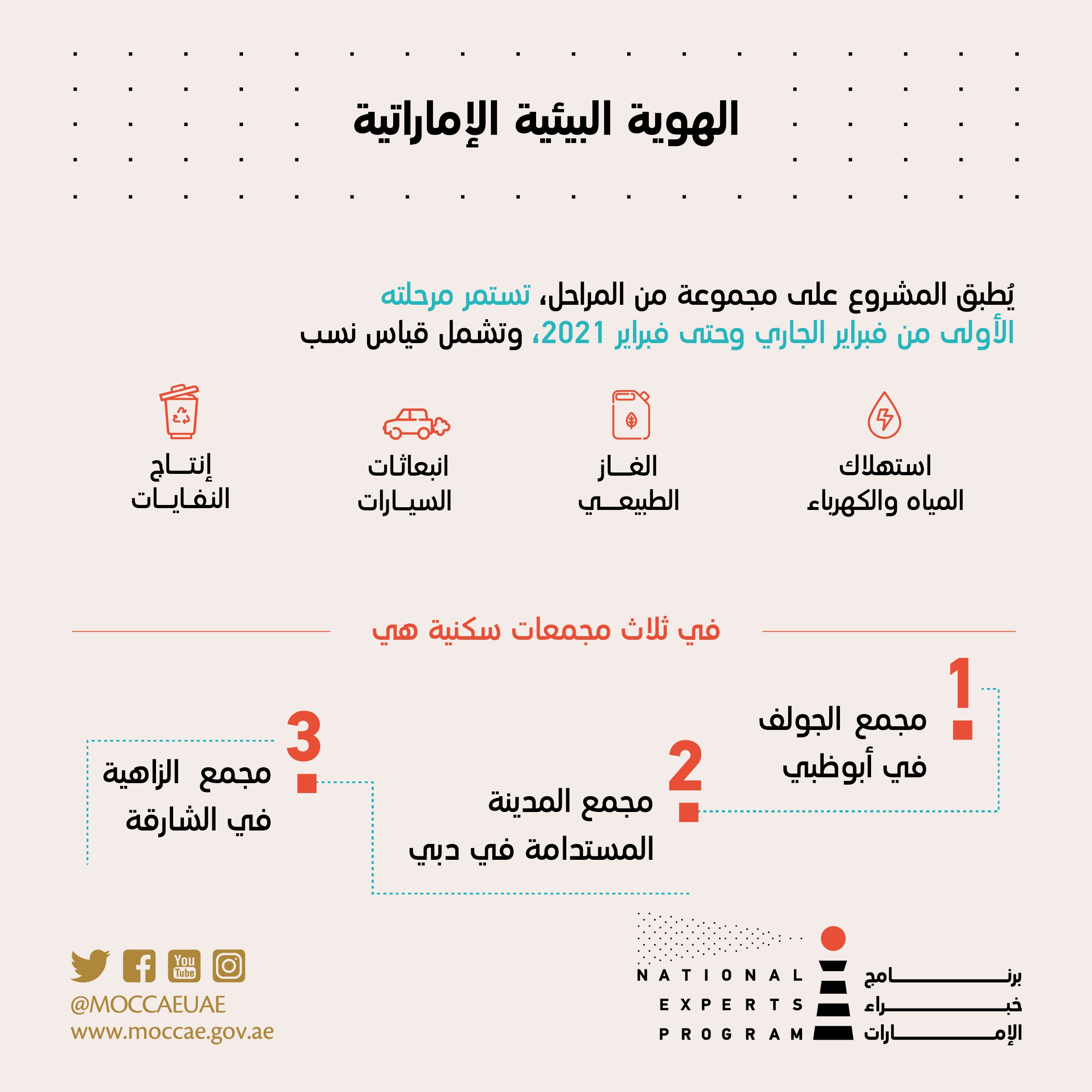 أطلق برنامج "خبراء الإمارات" ضمن مخرجاته في قطاع البنية التحتية والبيئة الذي يشرف عليه كموجه معالي الدكتور ثاني بن أحمد الزيودي وزير التغير المناخي والبيئة، مشروع "الهوية البيئة الإماراتية" والذي يستهدف إيجاد معدل قياس محدد للبصمة البيئية للأفراد على مستوى الدولة، عبر نظام ذكي يعزز من إمداد صناع القرار والمسؤولين بمعلومات وبيانات واضحة يتم بناء عليها رسم السياسات المستقبلية في هذا المجال.