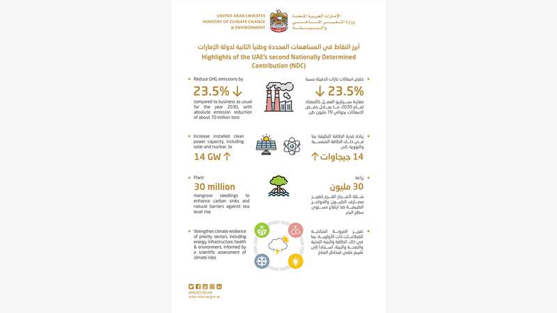 سلّمت دولة الإمارات العربية المتحدة مساهماتها المحددة وطنياً الثانية إلى أمانة اتفاقية الأمم المتحدة الإطارية بشأن تغير المناخ ، والتي تشمل رفع سقف هذه المساهمات بما يضم زيادة جهود خفض الانبعاثات وتعزيز الاعتماد على الطاقة النظيفة والتوسع في جهود تخزين الكربون ومشاريع الكربون الأزرق والنظم المستدامة للزراعة وإدارة النفايات.