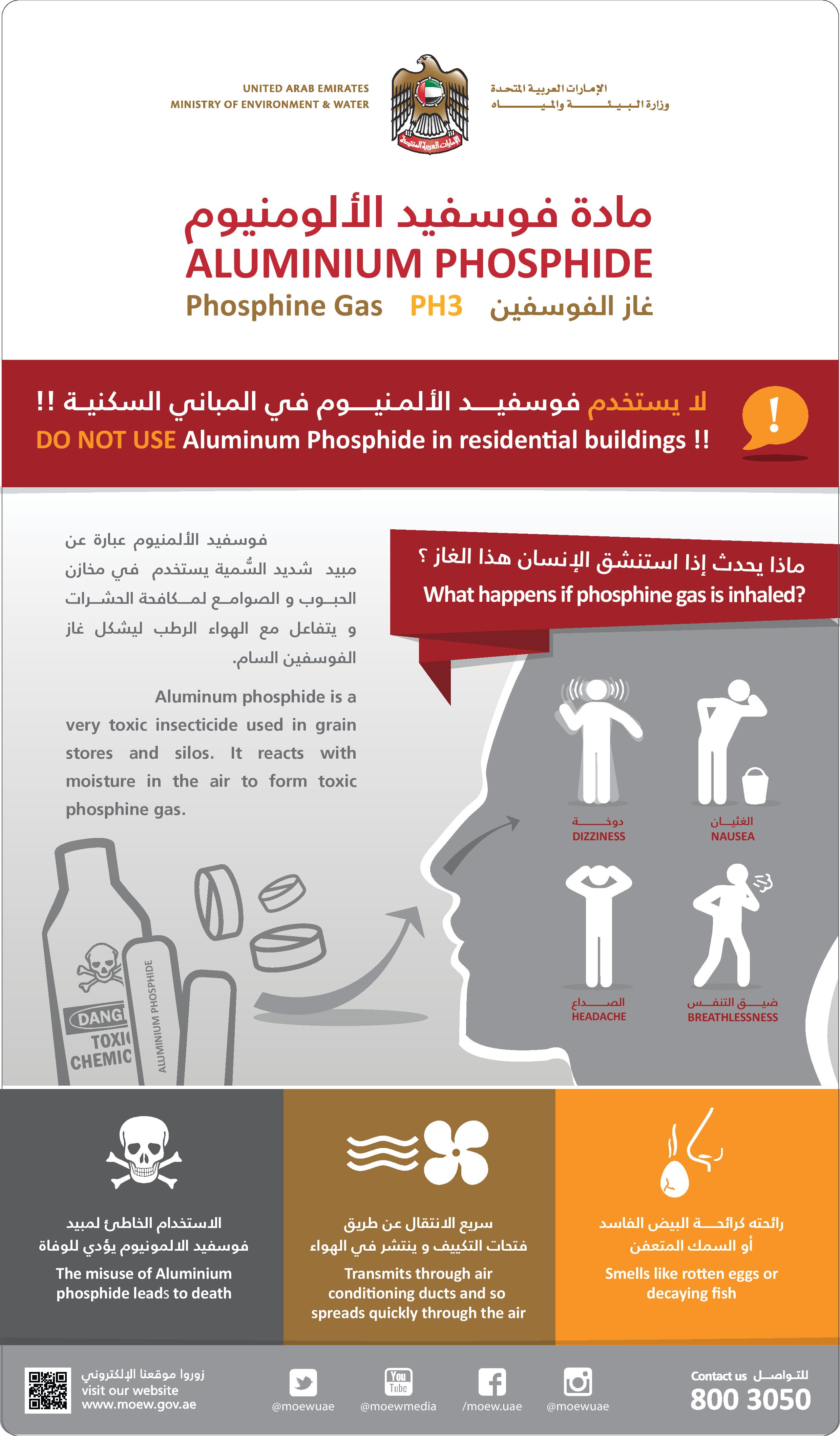 Eng. Othaibah Alqaydi - Director of Chemicals Department at MOEW stated that, “Aluminum Phosphide is banned by MoEW, and individuals should not use this pesticide to eradicate pests in residential and commercial areas as it is highly poisonous and could lead to intoxication and fatality.” She added that any violators using the pesticide could face prosecution.